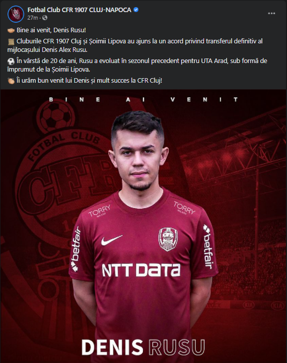 CFR a negociat cu Șoimii Lipova trabsferul sau. Cotat de tranfermarkt la 450 de mii de euro, Denis Rusu a recunoscut de ceva timp ca va semna cu CFR. pentru sportarad.ro: "„Incepand cu sezonul viitor, Denis Rusu va imbraca tricoul campioanei Romaniei, CFR Cluj. Am primit o oferta corecta atat noi ca si club, cat si jucatorul, sunt sume si conditii mult peste ce au oferit alte cluburi si nu a putut fi refuzata. Am pastrat si un procent dintr-un viitor transfer, astfel ca o evolutie foarte buna a lui Denis ar putea sa ne mai aduca inca o suma consistenta la un ulterior transfer.