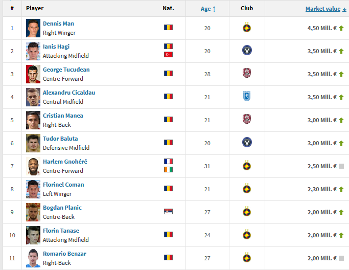 Ultimul update transfermarkt ii aduce un milion in plus lui Ianis Hagi fata de luna decembrie a anului trecut. Hagi Jr. e evaluat la 3,5 milioane de euro si e al doilea intre cei mai scumpi fotbalisti din Romania. Dennis Man e primul, evaluat la 4,5 milioane. Tot 3,5 milioane ar fi valoarea reala a lui Tucudean (CFR Cluj) si Cicaldau (CSU Craiova).