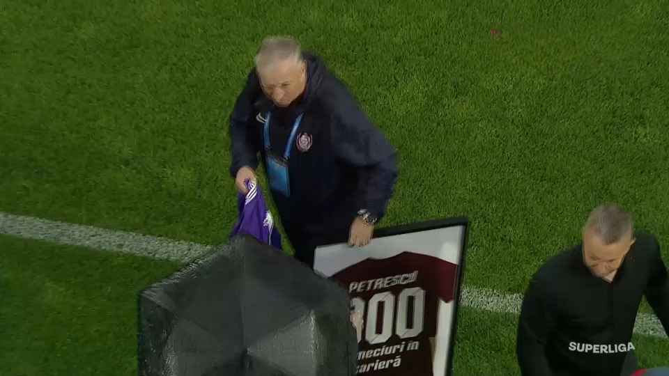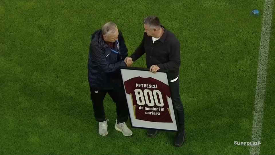 Înaintea primului fluier din CFR Cluj - FC Argeș, Dan Petrescu a primit pe teren un tricou înrămat cu numărul 800. Antrenorul s-a fotografiat cu președintele Cristi Balaj, a fost aplaudat de suporteri, iar reprezentanții lui FC Argeș i-au oferit și ei un tricou fostului mare internațional.