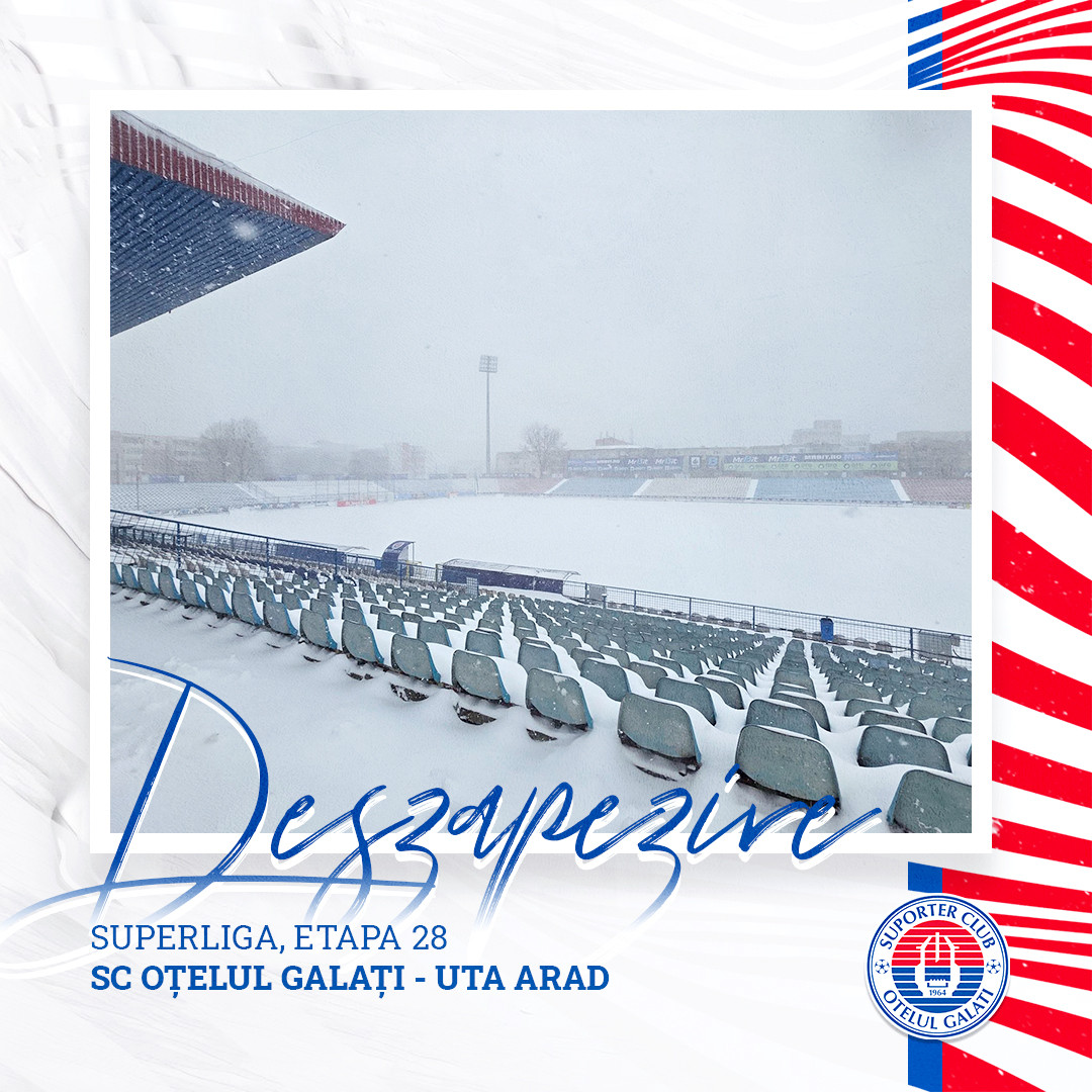“Din cauza cantităţii mari de zăpadă, intrarea la partida de mâine, Oţelul Galaţi - UTA Arad, va fi LIBERĂ, iar accesul se va face EXCLUSIV la tribuna 2 a stadionului Oţelul. Inclusiv abonaţii de la tribuna 1 şi peluze vor avea acces în cealaltă zonă a arenei - numai la Tribuna Zero se va intra normal, pe baza abonamentului”, a precizat gruparea gălăţeană, potrivit News.ro.