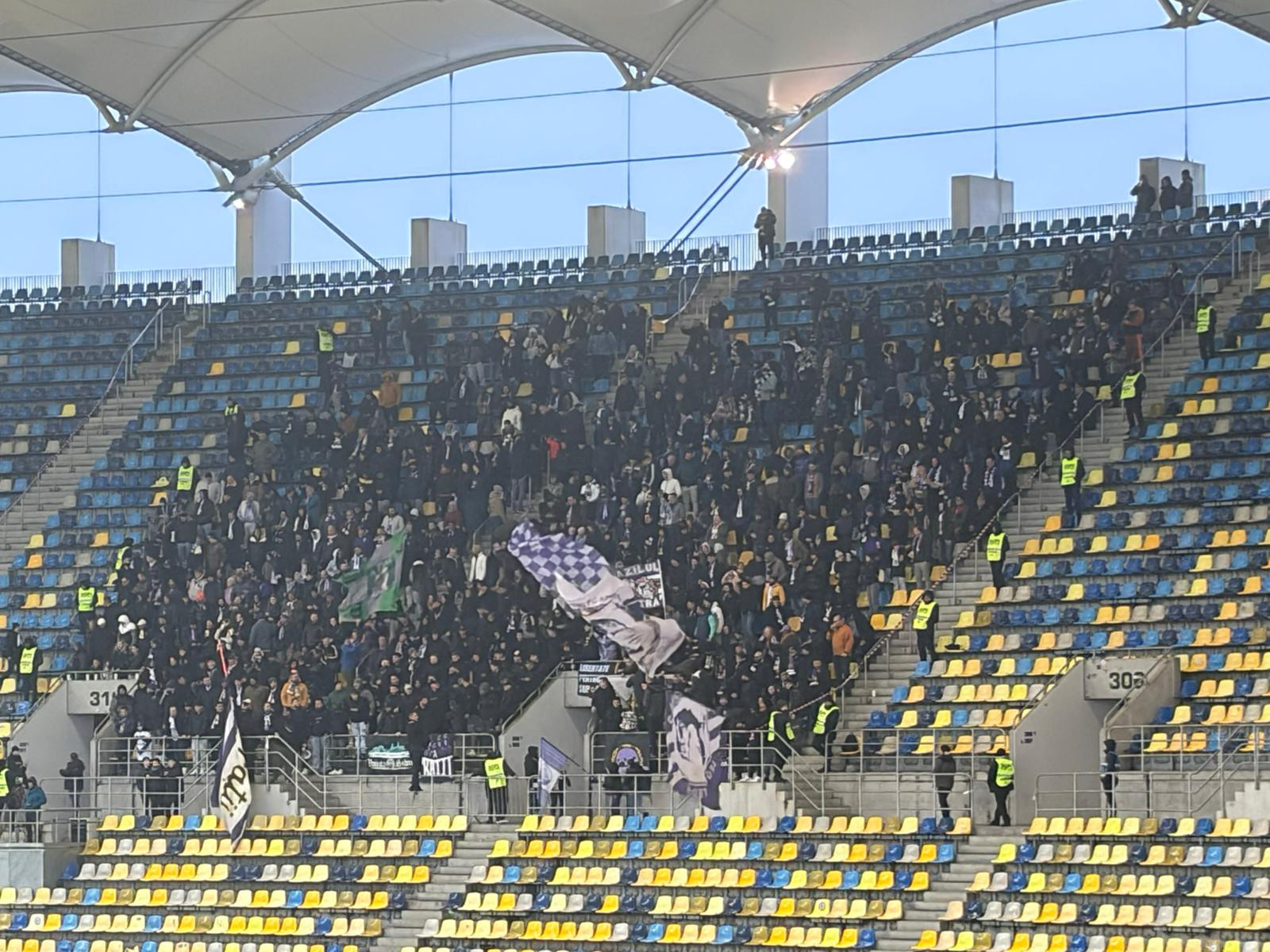 Minutul 31: Joc modest al lui Dinamo până în acest minut. Deși domină la capitolul posesie, ”câinii” nu reușesc să țină jocul aproape de poarta lui Cătălin Căbuz. Până acum, Epassy și fundașii ”roș-albilor” au fost puși serios la încercare de piteșteni. La această partidă, oaspeții sunt susținuți de un număr impresionant de suporteri.