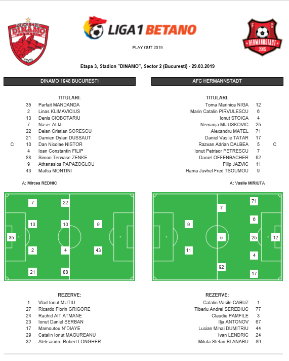 Dinamo: Mandanda - Klimavicius, Ciobotariu, Aliji, Sorescu, Dussaut, Nistor, Filip, Zenke, Papazoglou, Montini