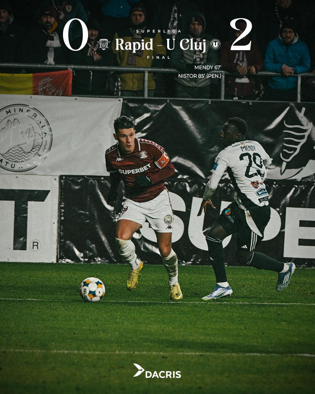 Rapid a fost învinsă de U Cluj cu 2-0 sâmbătă seara în Giuleşti, în etapa a 24-a din Superligă, astfel că a ratat şansa de a urca pe primul loc.