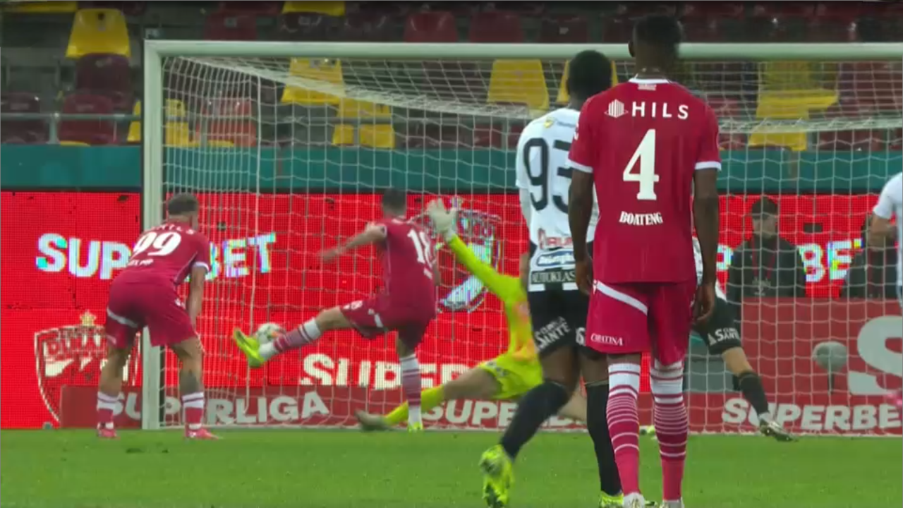 Min. 43: Ce fază! Selmani trimite cu exteriorul spre poartă, Gertmonas alunecă, dar, în cele din urmă, reușește să scoată de pe linia porții și le oferă un corner bucureștenilor.