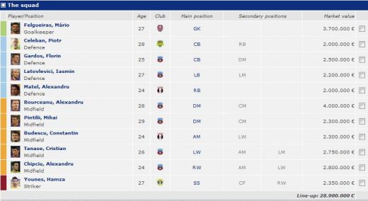 Conform transfermarkt.de cel mai scump prim 11, valoreaza 28.9 milioane de euro, iar cel scump jucator din aceasta echipa ar fi Bourceanu, cotat la 4 milioane.