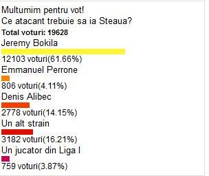 Pe site-ul www.sport.ro, aproape 20.000 de fani au votat la intrebarea cine ar trebui sa-l inlocuiasca pe Raul Rusescu. Iar aproape 62% dintre acestia l-au desemnat pe Jeremy Bokila! Atacantul celor de la Petrolul a impresionat in sezonul trecut, marcat unicul gol in finala Cupei Romaniei.
