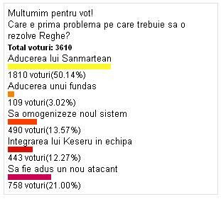 De asemenea, un procent important al suporterilor crede ca Steaua ar trebui sa faca un transfer, insa nu cel al lui Sanmartean, ci sa aduca un atacant care sa poata atinge rata de goluri a lui Raul Rusescu, golgheterul din sezonul trecut.