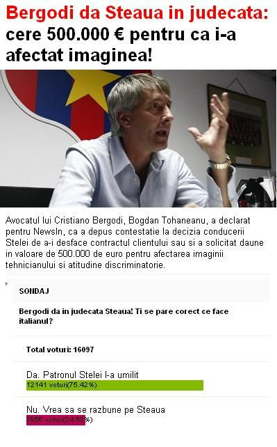 Fanii care au votat pe www.sport.ro ii dau dreptate lui Bergodi: 12141 ( 75% ) de oameni cred ca decizia lui Bergodi de a da Steaua in judecata este corecta, in timp ce doar 3956 ( 25% ) cred ca italianul vrea sa se razbune pe Steaua.