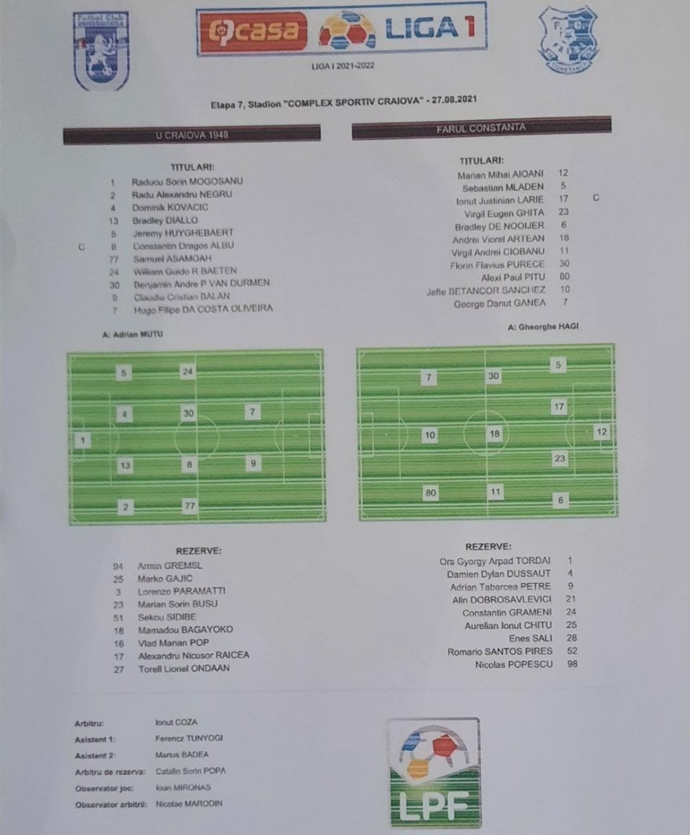 FCU Craiova și Farul Constanța au remizat în etapa cu numărul șapte din Liga 1.