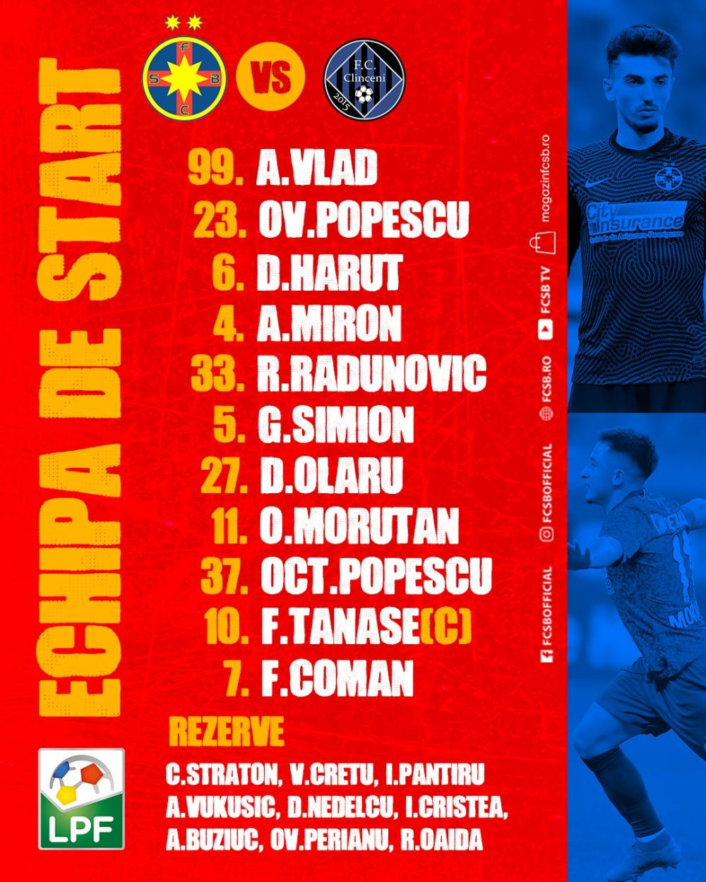 FCSB: Vlad - Ovidiu Popescu, Harut, Cristea, Radunovic - Olaru, Morutan, Oaida - Octavian Popescu, Tanase, Coman