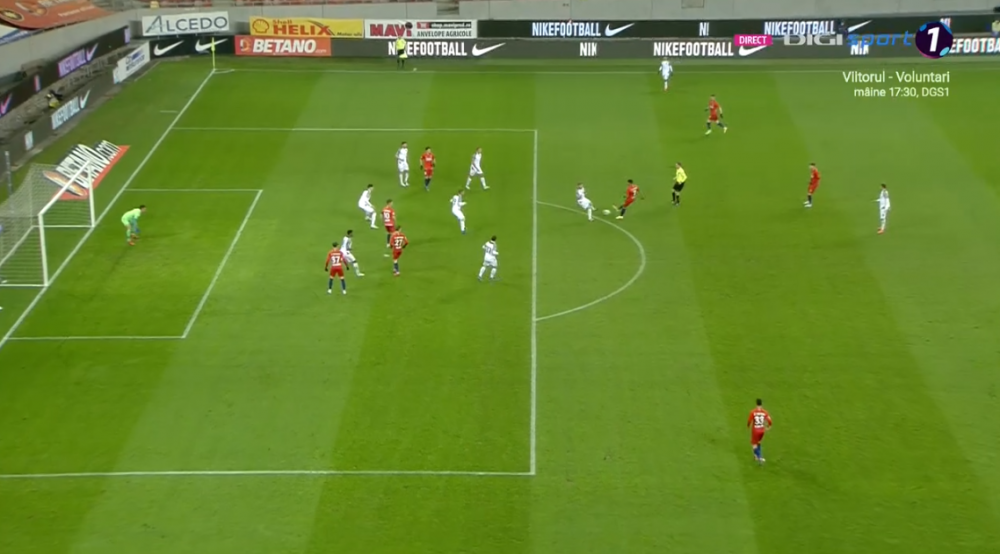 min 27: Sansa uriasa de gol pentru Rusescu! Atacantul e gasit de o centrare trimisa de Popa liber la 11 metri, insa reluarea sa nu nimereste cadrul portii.