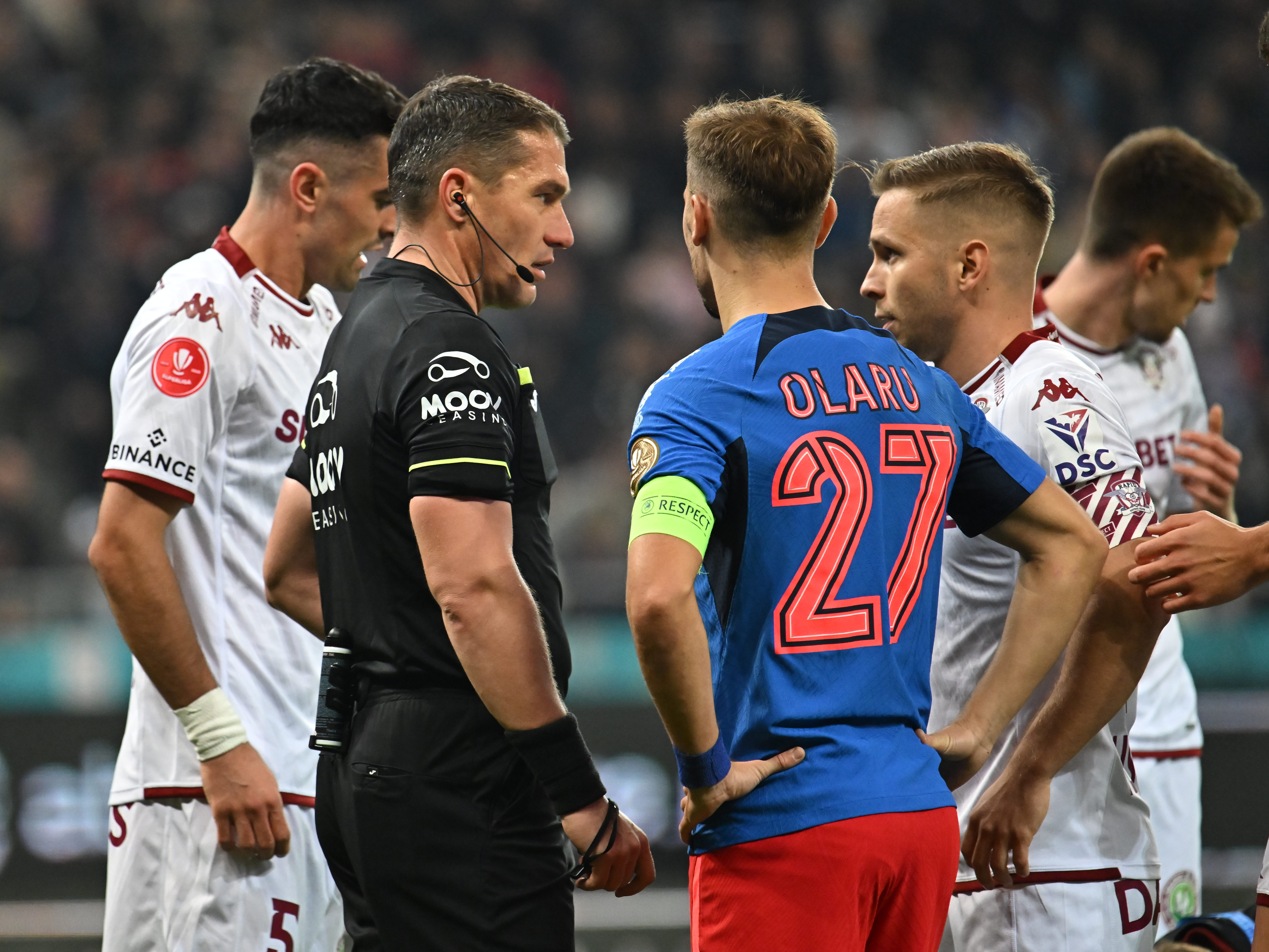 Roș-albaștrii au cerut penalty în minutul 25, după un duel petrecut între Florin Tănase și Boupendza, însă Istvan Kovacs a lăsat jocul să continue.