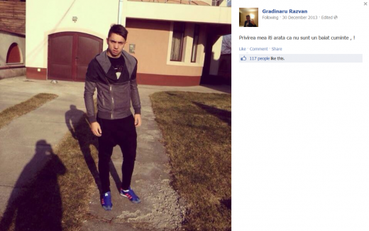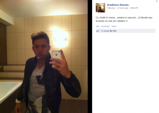 Gradinaru pare sa se inscrie intr-o serie lunga de jucatori talentati care se gandesc mai mult la femei si bani decat la fotbal. "Cu cheile in mana, masina in parcare, si blonda sau bruneta nu mai are rabdare!!", este textul de la poza de profil al lui Razvan Gradinaru, un text ce pare desprins din filmele cu Mihai Costea sau Printul Cristea.
