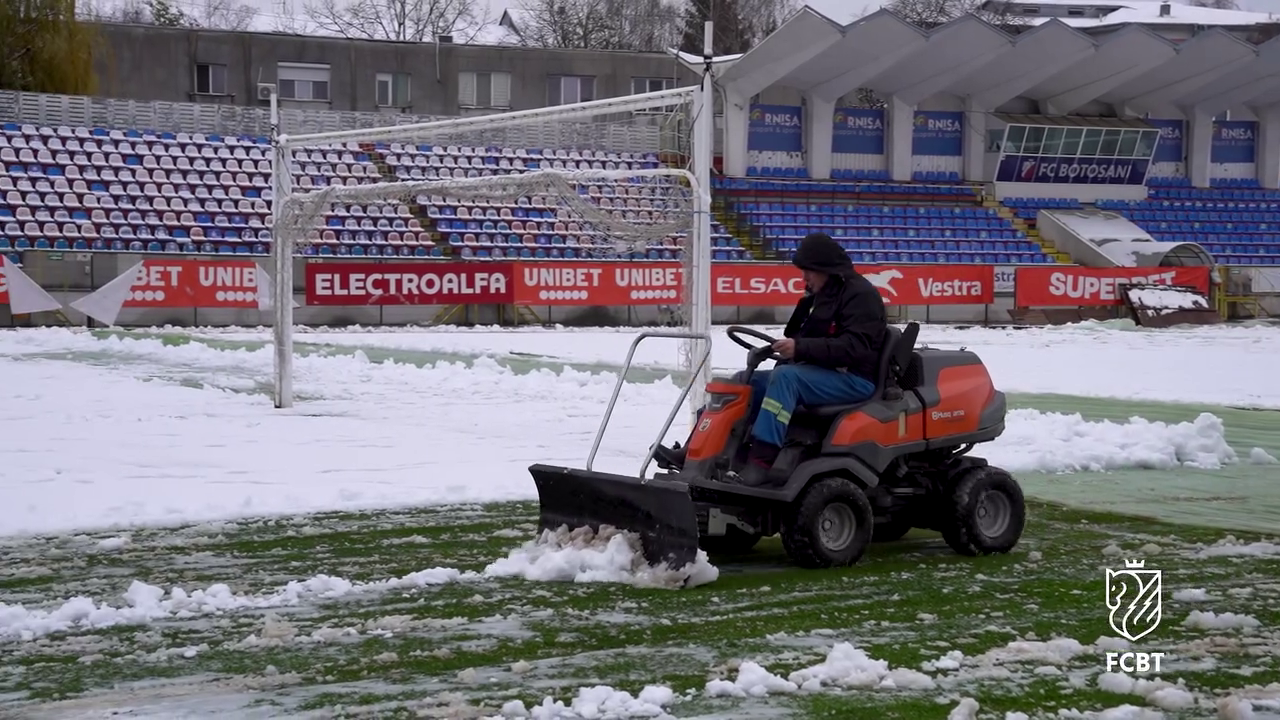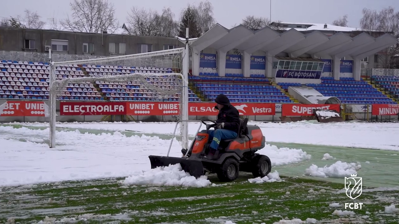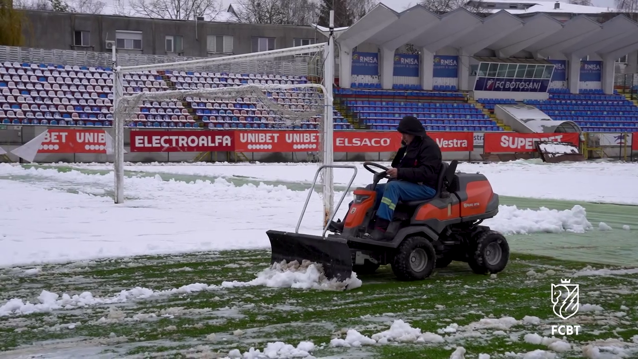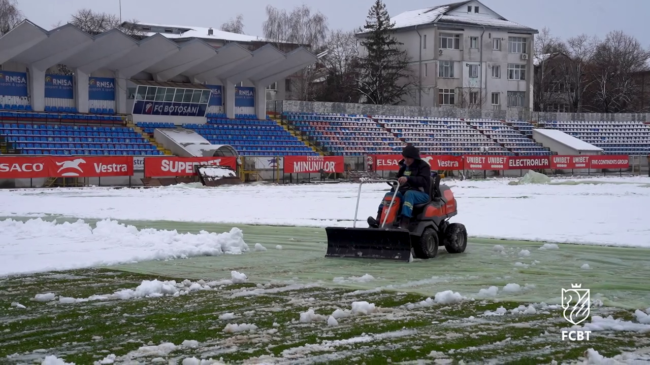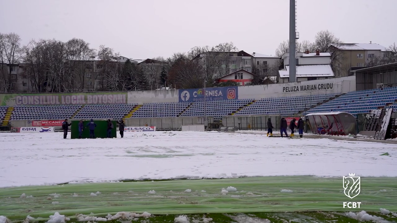 Angajații Primăriei, alături de reprezentanții clubului FC Botoșani, s-au mobilizat pentru a îndepărta stratul de zăpadă acumulat deasupra foliei, astfel încât meciul să poată avea loc fără probleme majore.
