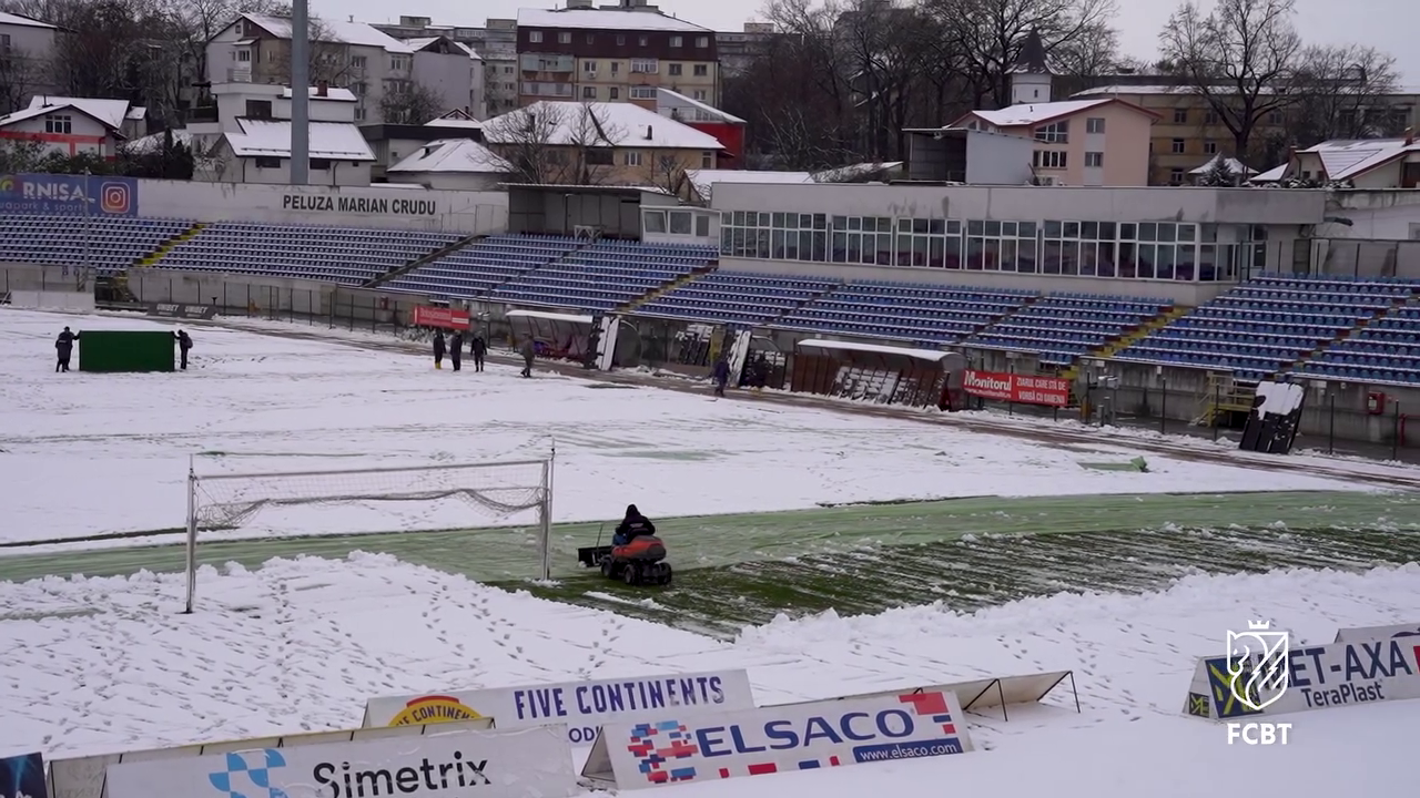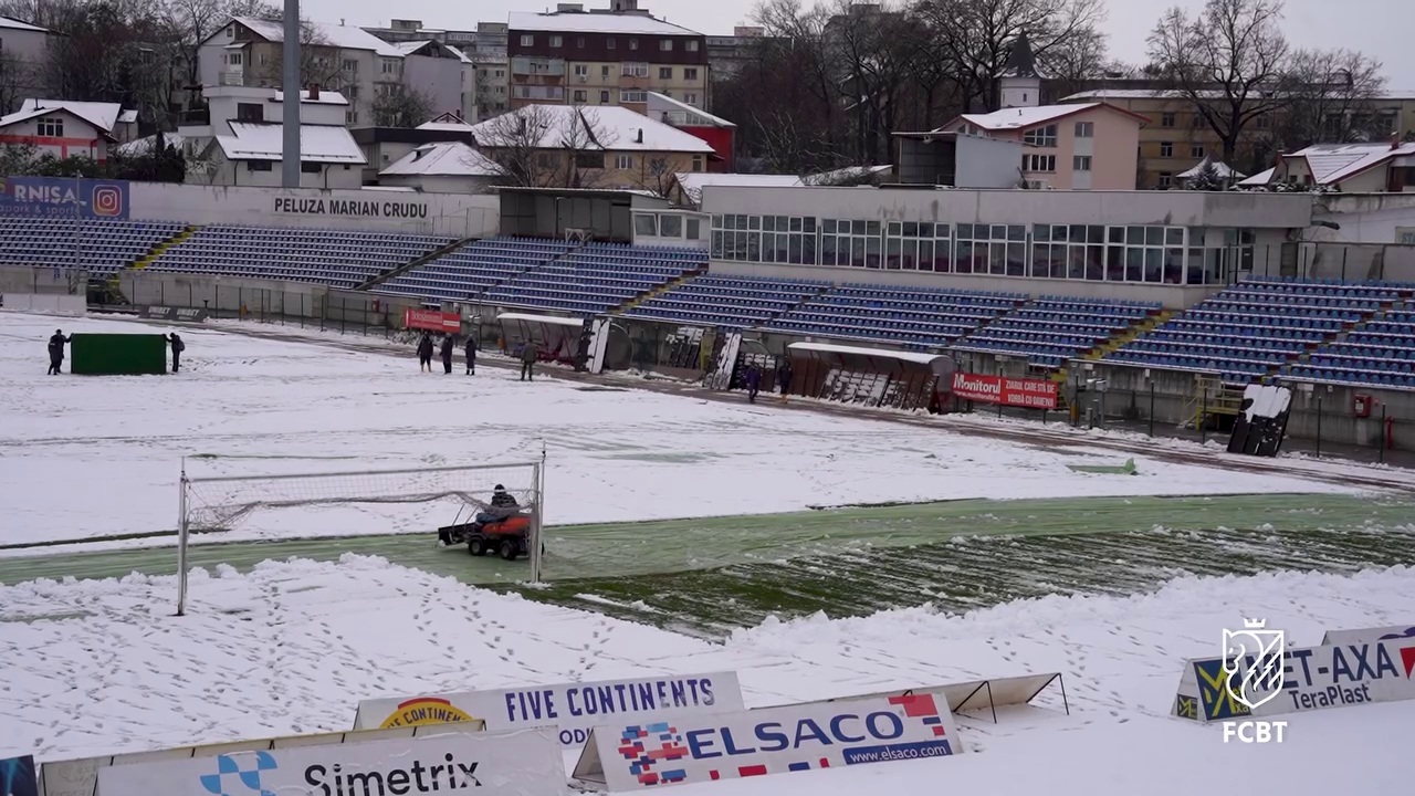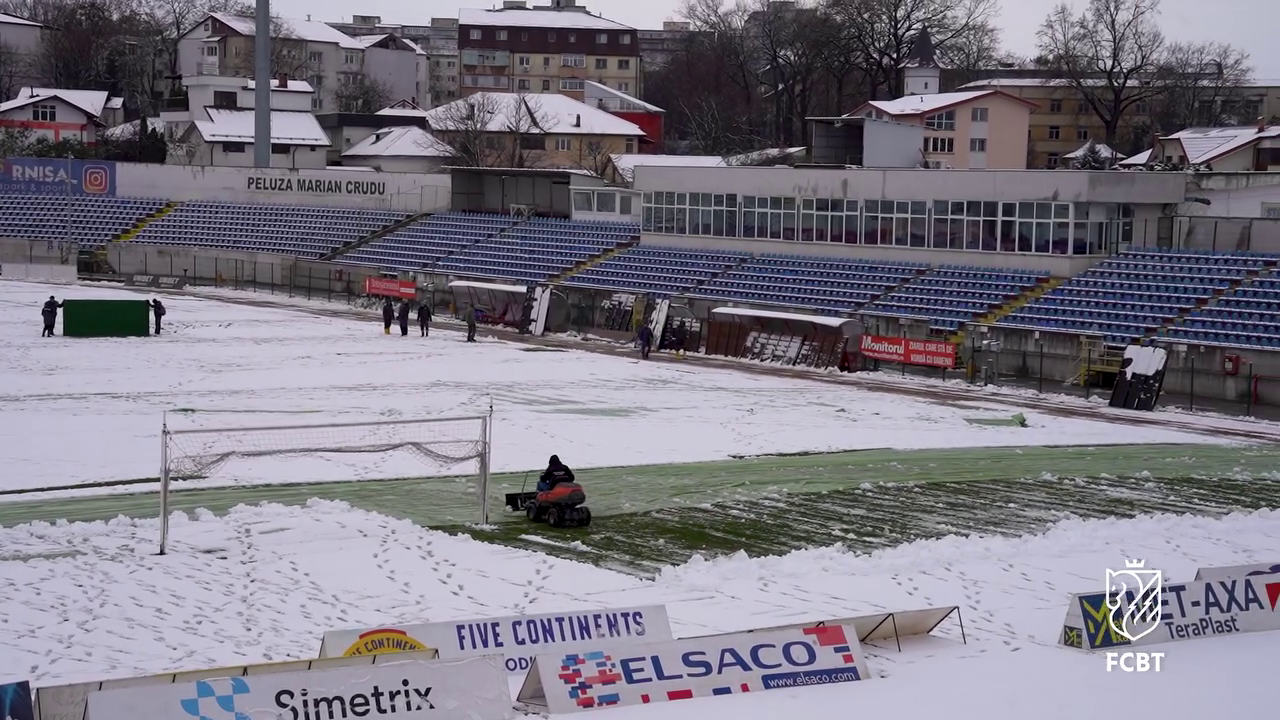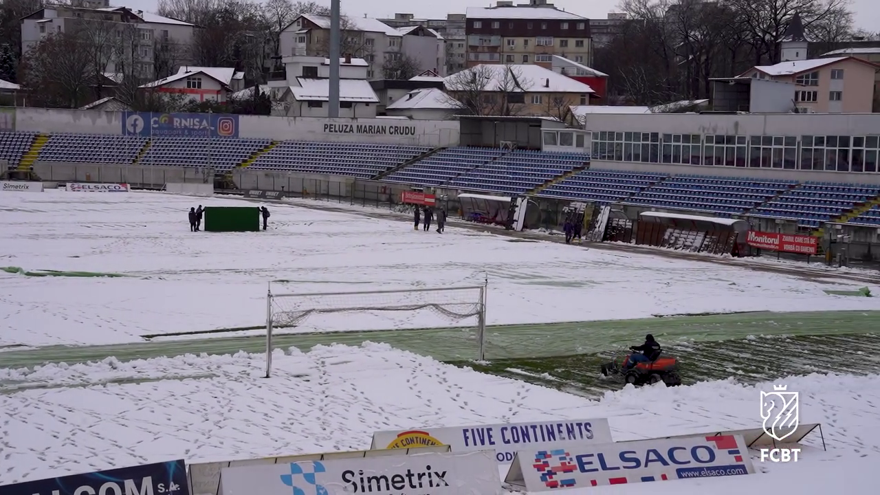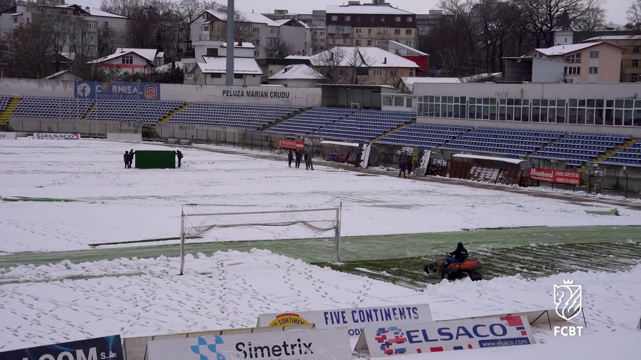 Angajații Primăriei, alături de reprezentanții clubului FC Botoșani, s-au mobilizat pentru a îndepărta stratul de zăpadă acumulat deasupra foliei, astfel încât meciul să poată avea loc fără probleme majore.