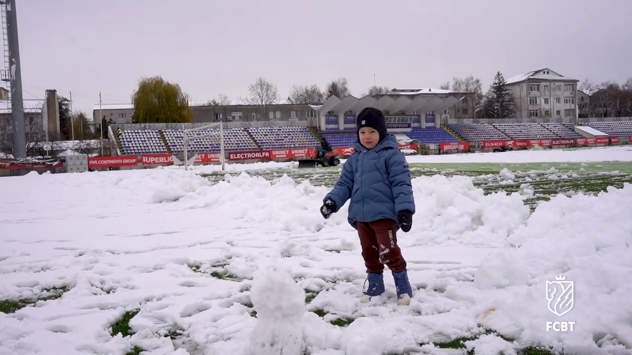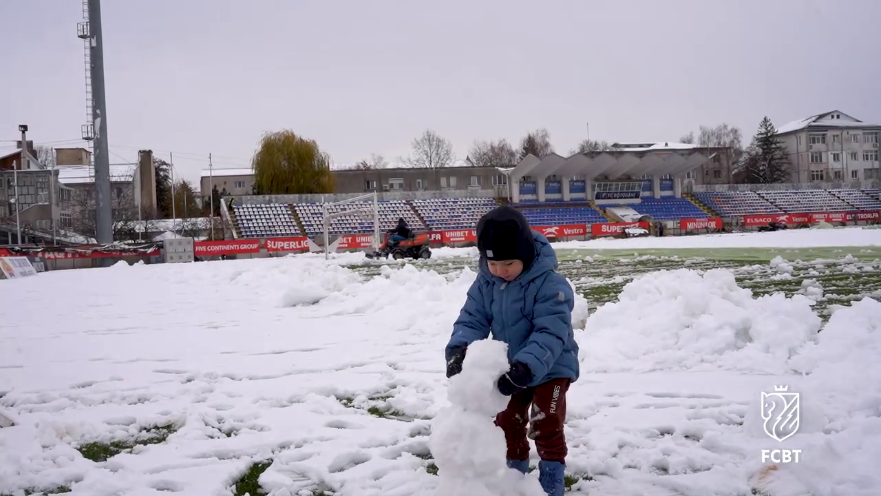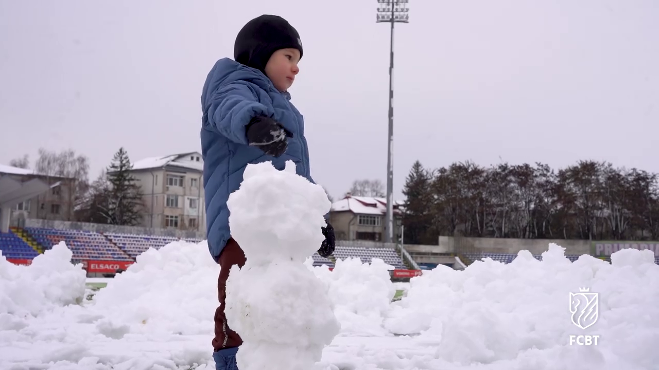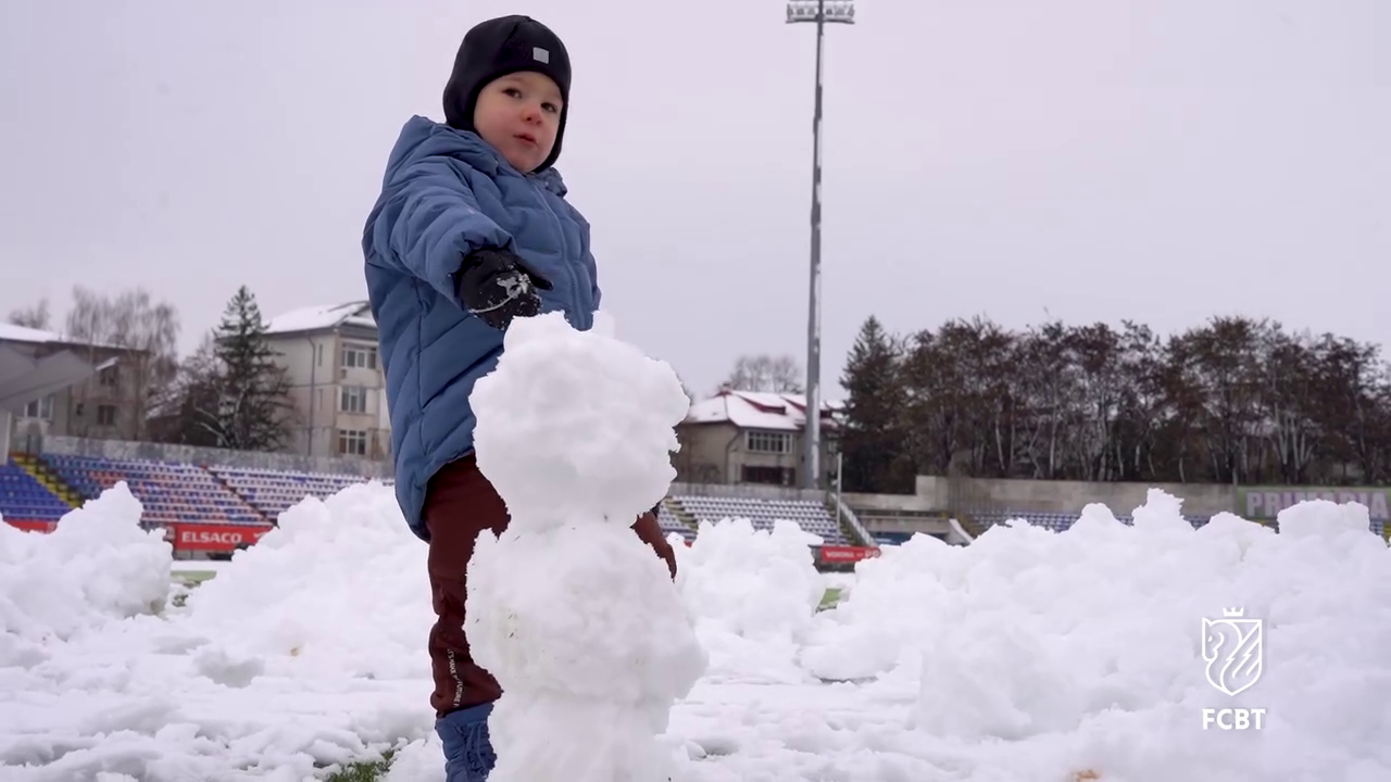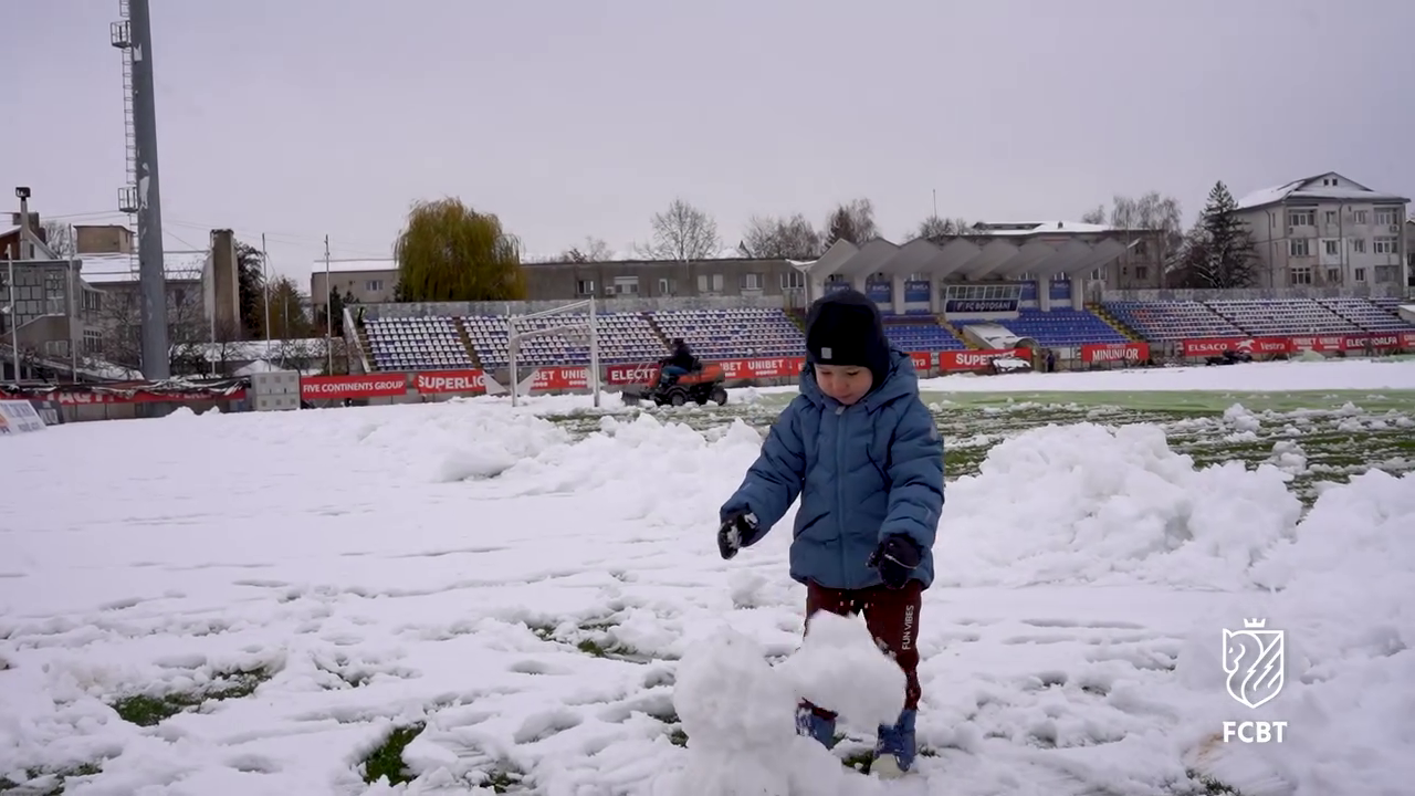 În timp ce staff-ul tehnic muncea pentru a curăța terenul, un copil mic, cel mai probabil fiul unui oficial al clubului, a profitat de zăpada de pe gazon.