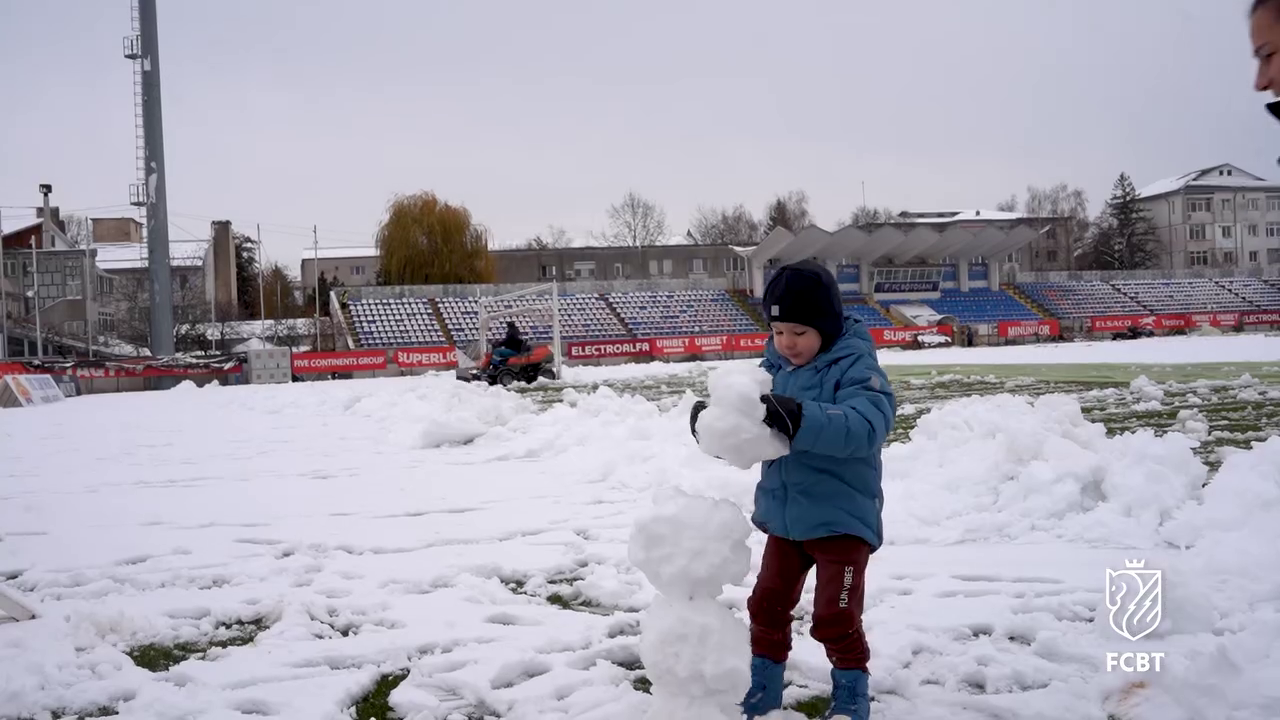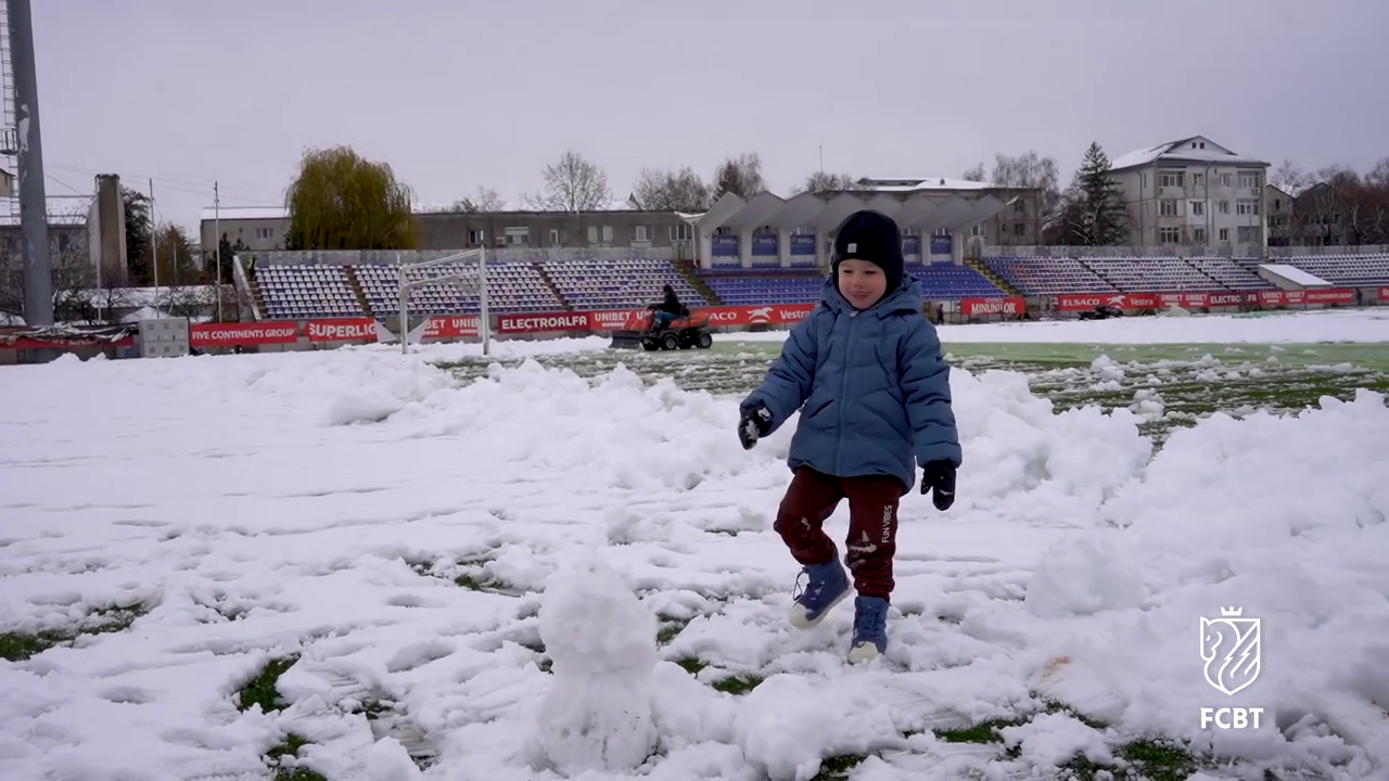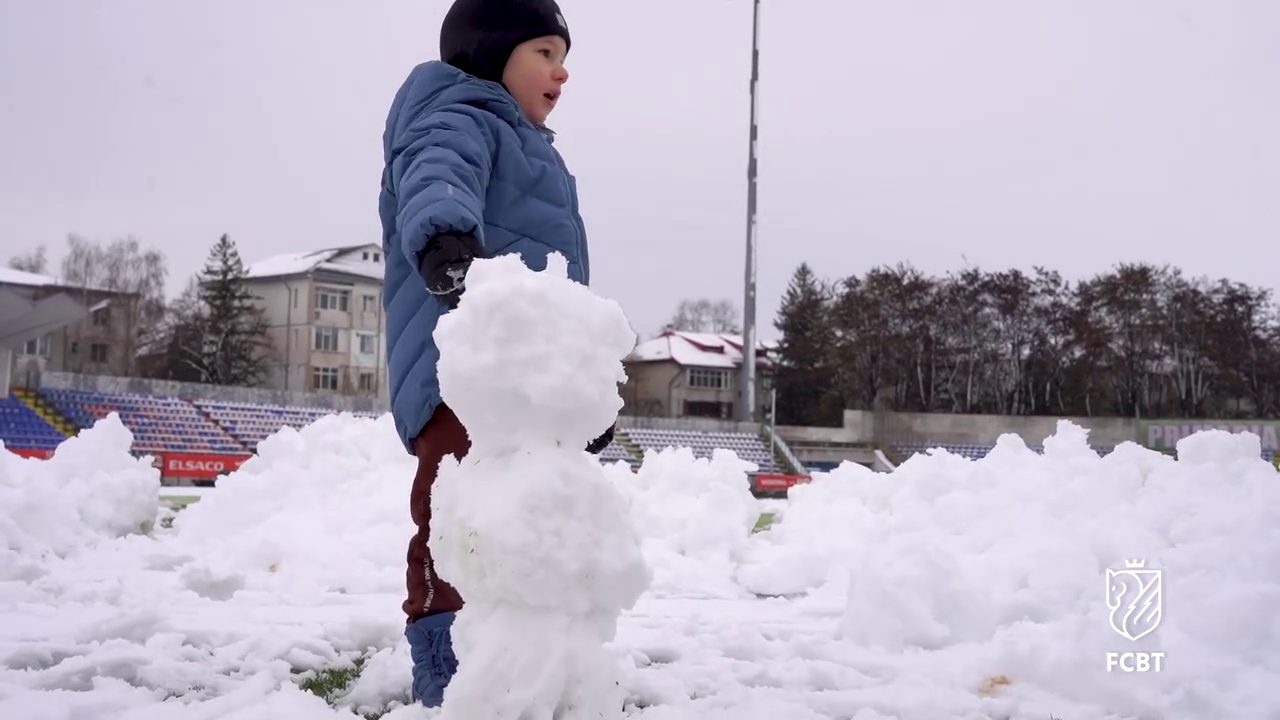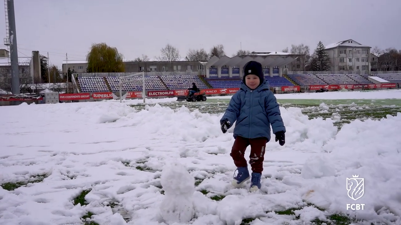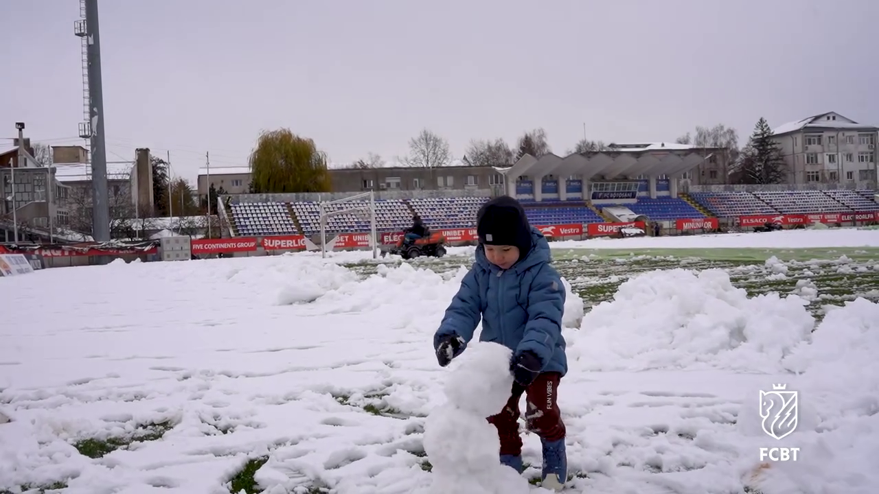 În timp ce staff-ul tehnic muncea pentru a curăța terenul, un copil mic, cel mai probabil fiul unui oficial al clubului, a profitat de zăpada de pe gazon.