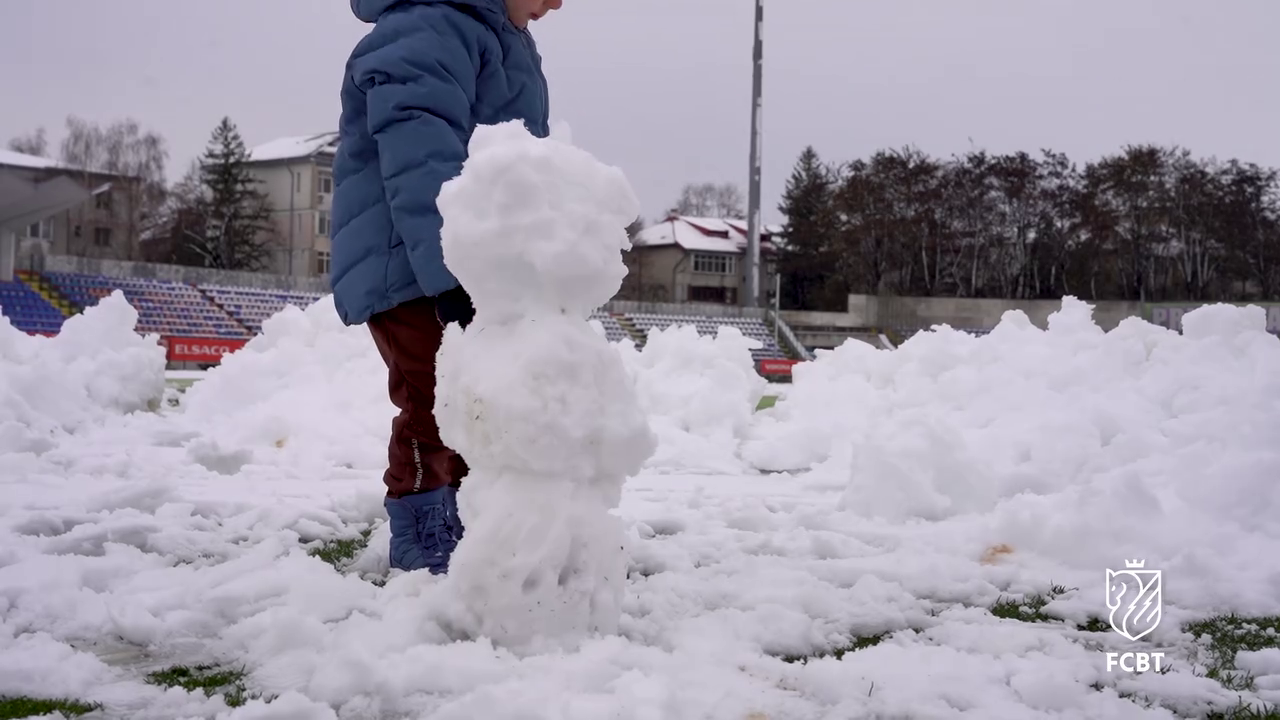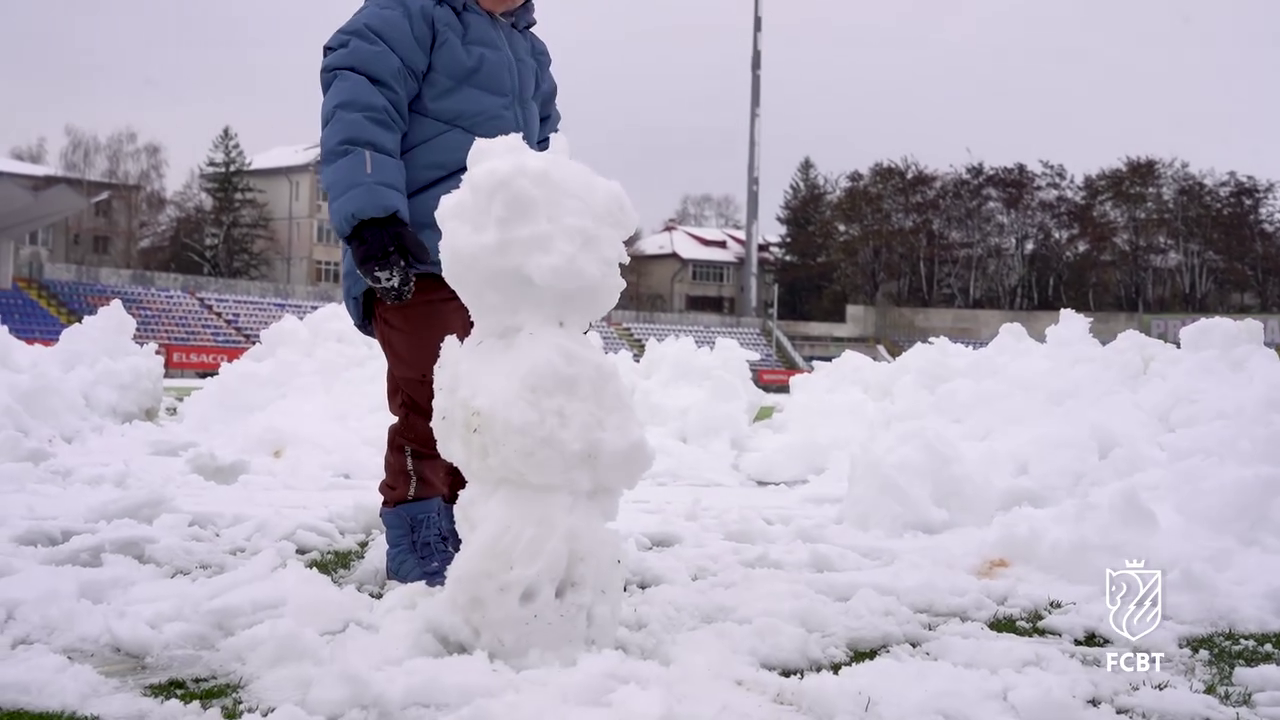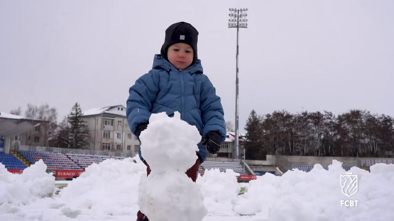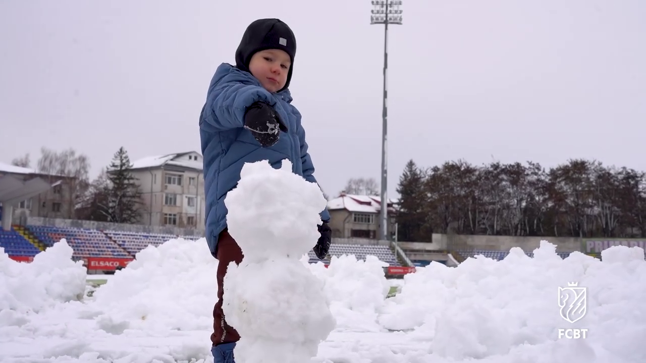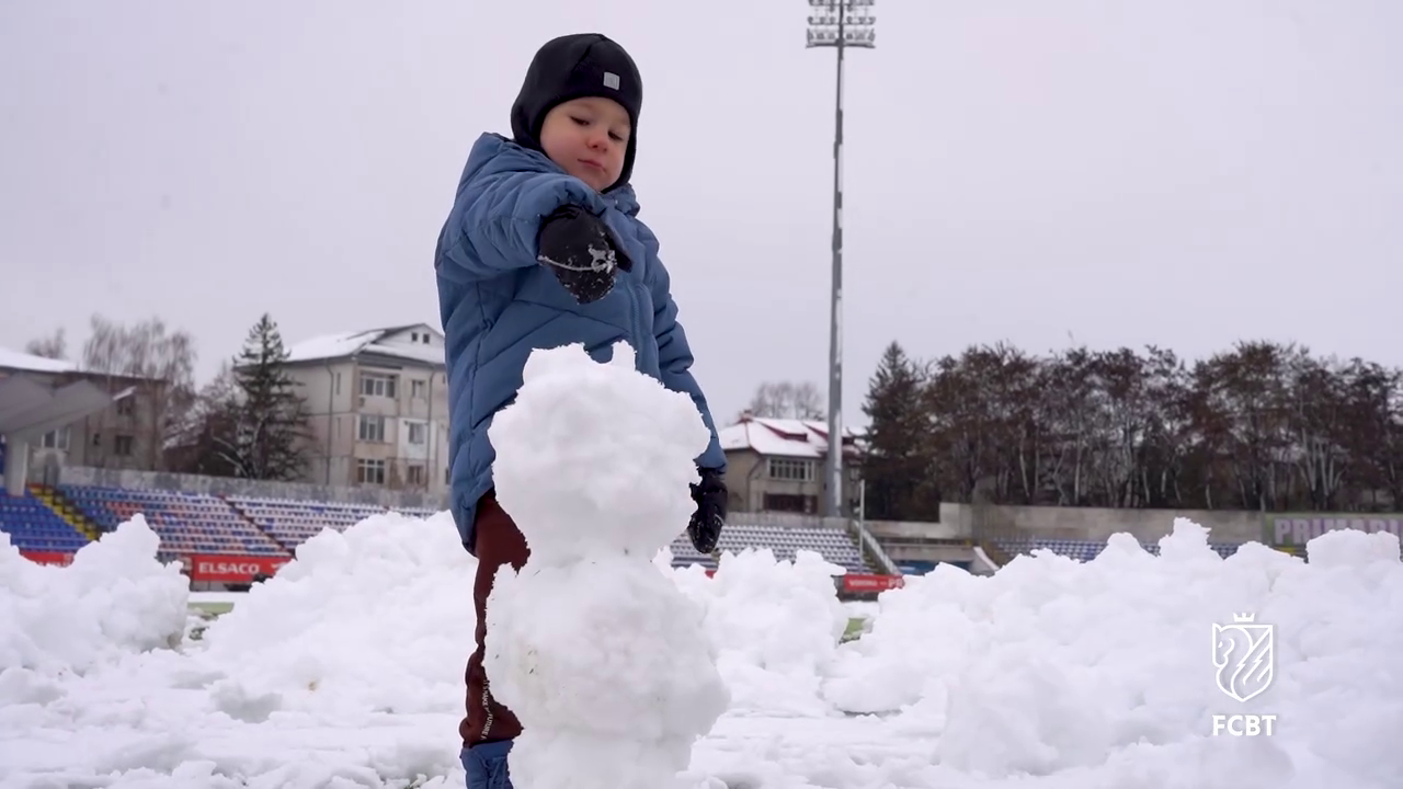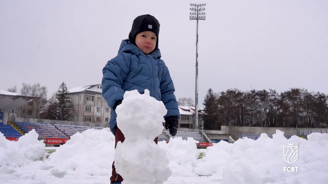 În timp ce staff-ul tehnic muncea pentru a curăța terenul, un copil mic, cel mai probabil fiul unui oficial al clubului, a profitat de zăpada de pe gazon.