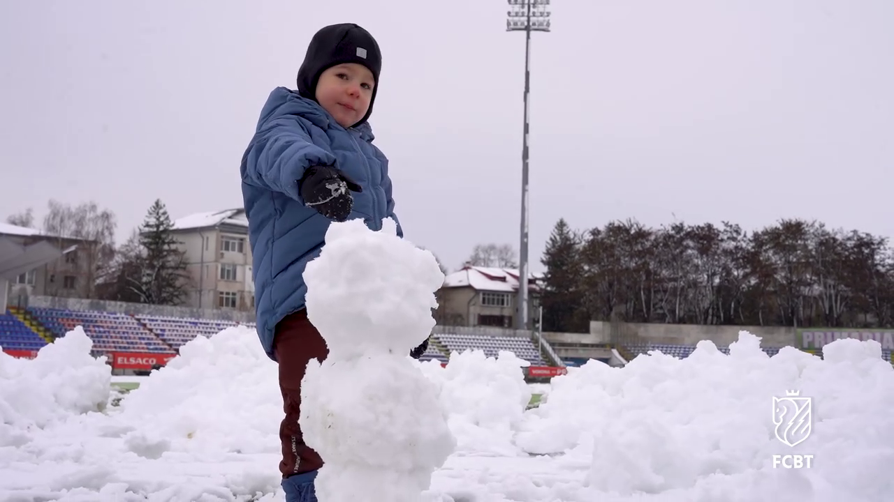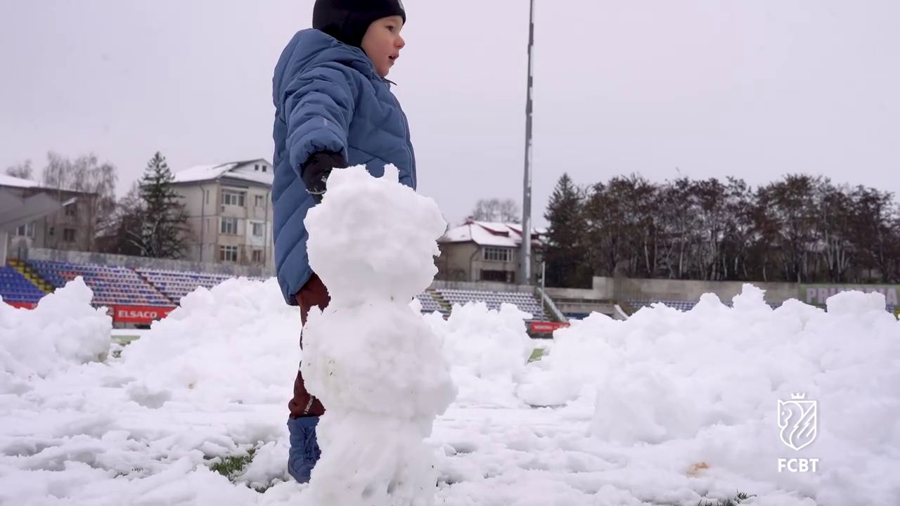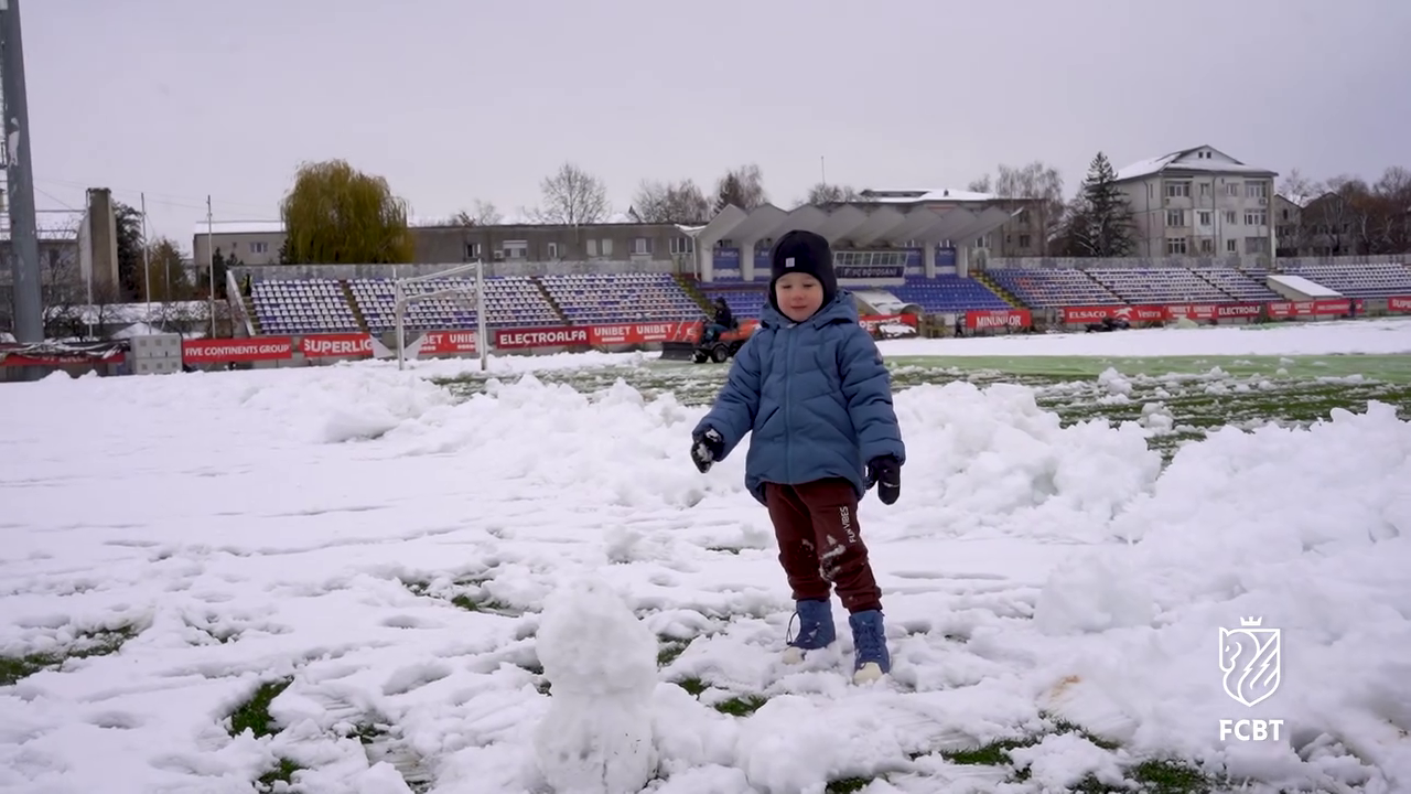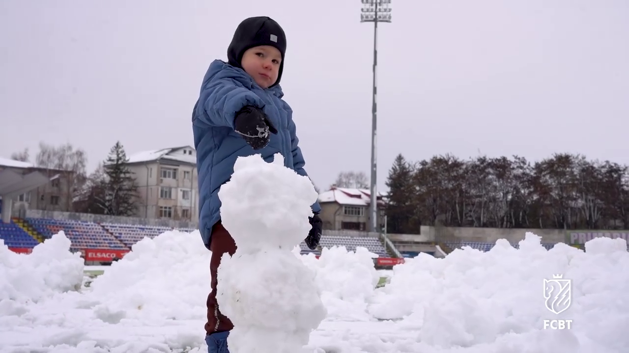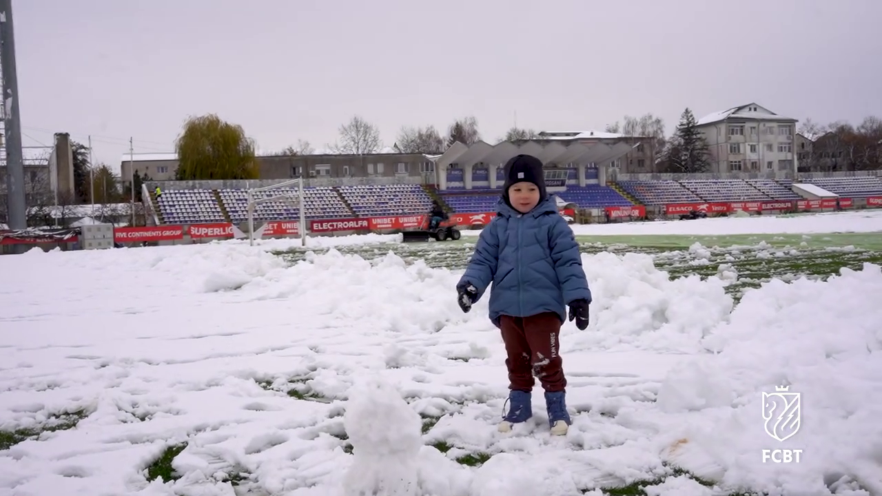 În timp ce staff-ul tehnic muncea pentru a curăța terenul, un copil mic, cel mai probabil fiul unui oficial al clubului, a profitat de zăpada de pe gazon.