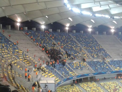 ► Au venit si baietii de la FC Basel in tribune. Sincer sa fiu, si daca e sa fac o gluma, erau intr-un tarc frumos, afara, paziti. Erau destul de multi. Aici, doar vreo 50-60, cam asa. Hai, pe bune ca erau mai multi :)) Oare ii auzim in seara asta? Aaaa si ce urat au facut cand au intrat jucatorii la incalzire: FCB, FCB se auzea. Cam inimosi, iata-i: