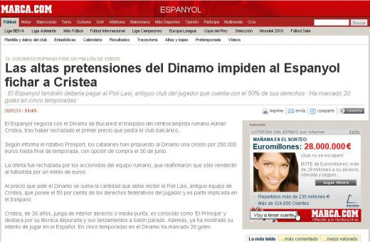 Spaniolii de la Marca scriu ca Espanyol negociaza cu Dinamo trecerea lui Cristea la Barcelona, pretul cerut de dinamovisti pentru "Printul" lor constituie o problema insa.