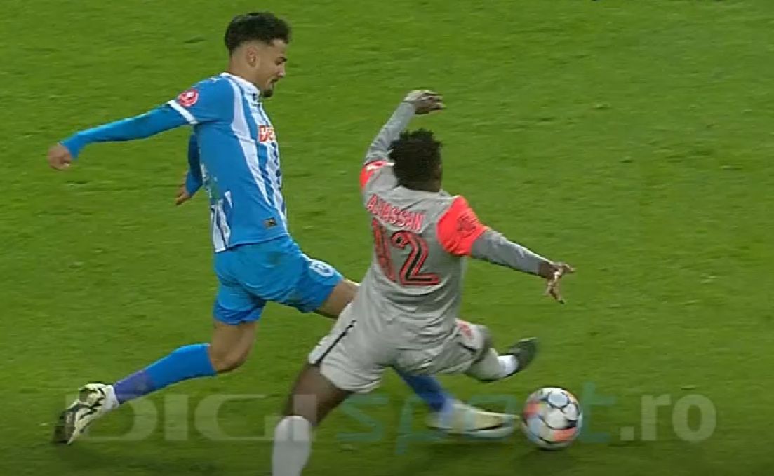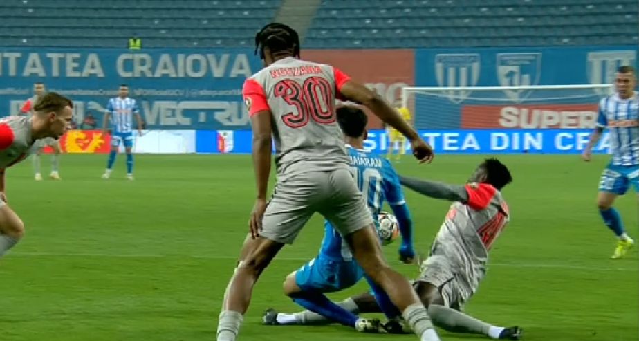 După intervenția VAR, Florin Andrei a considerat că Ștefan Baiaram a fost faultat de Baba Alhassan și a dictat penalty pentru Universitatea Craiova.