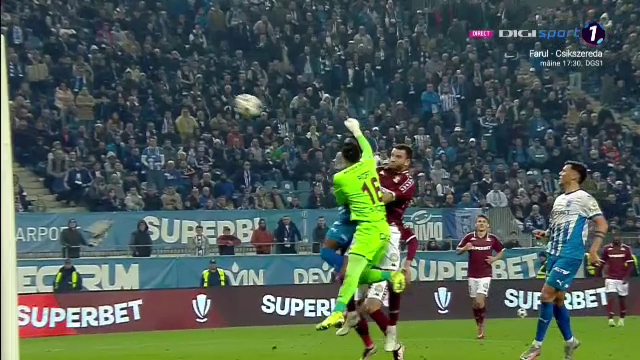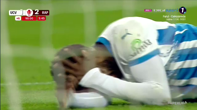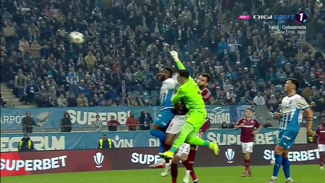 În prelungirile partidei, la scorul de 2-1 pentru Rapid, totul s-a aprins după o fază tensionată în careul bucureștenilor. După o centrare din flanc, Steven Nsimba a sărit la cap, iar portarul Marian Aioani a ieșit violent și l-a lovit din plin pe atacantul francez.