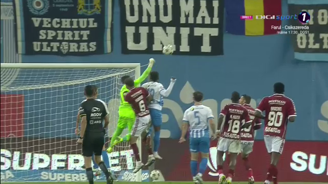 Nsimba s-a prăbușit pe gazon, iar oltenii au protestat furios. Arbitrul Marcel Bîrsan a consultat VAR-ul și a dictat penalty pentru Universitatea Craiova.