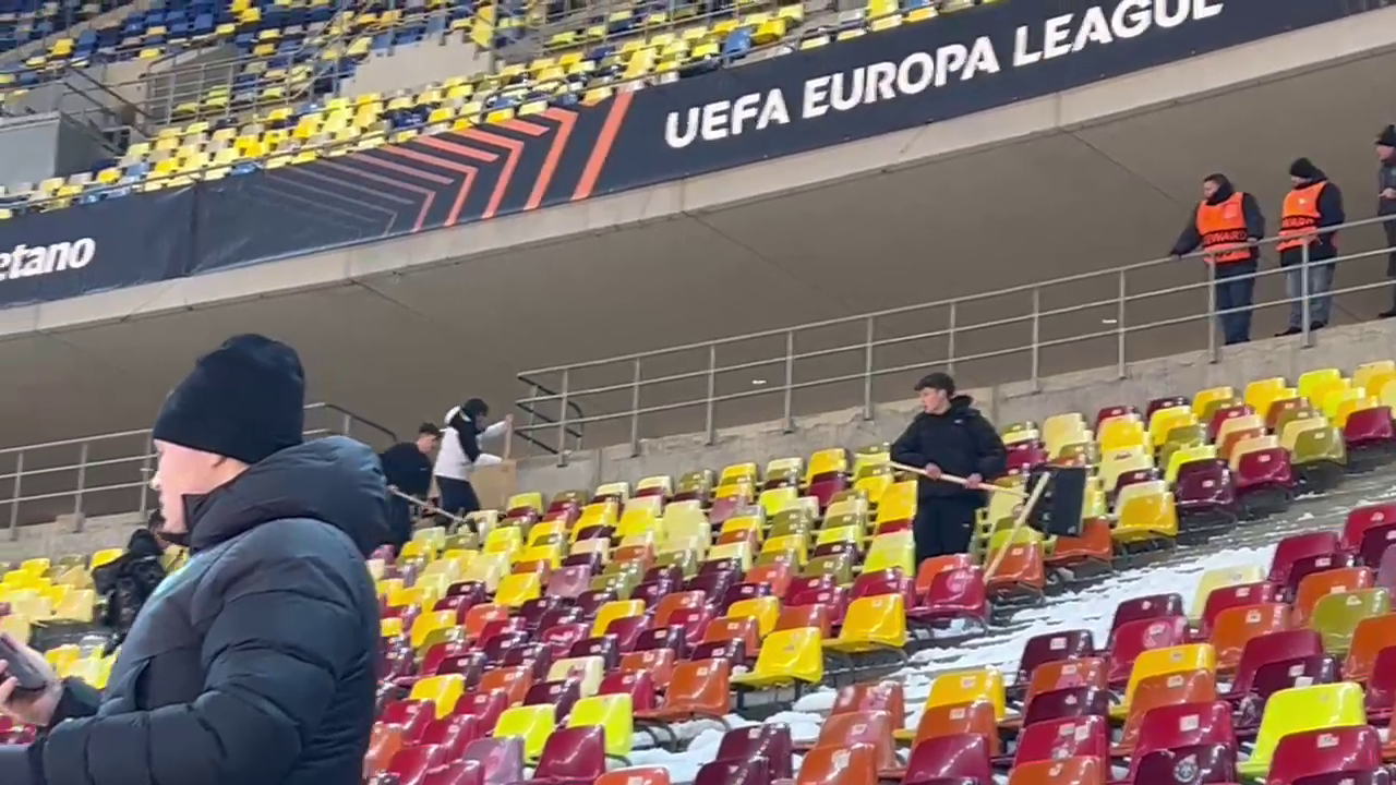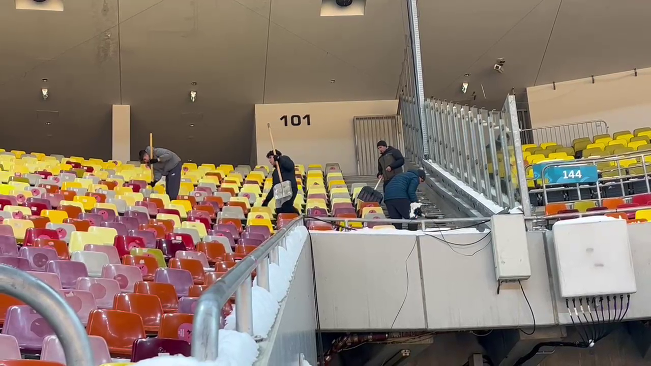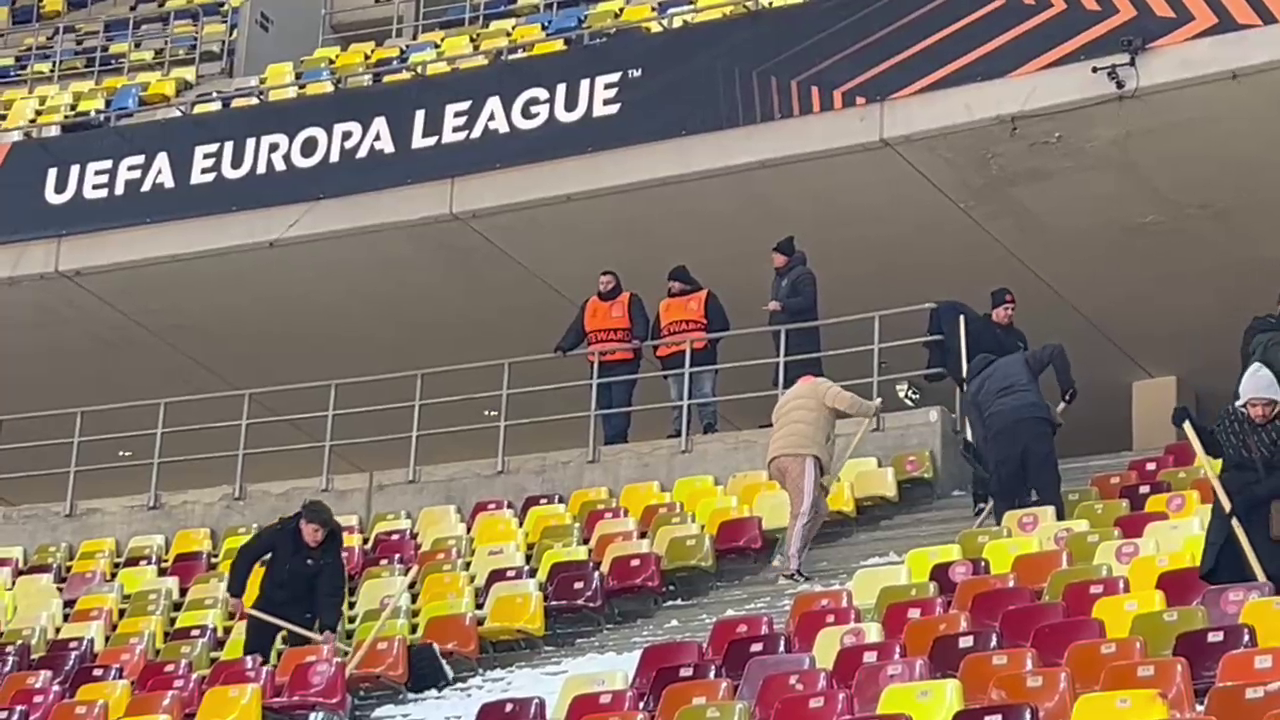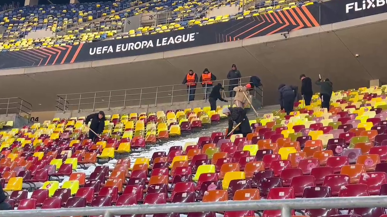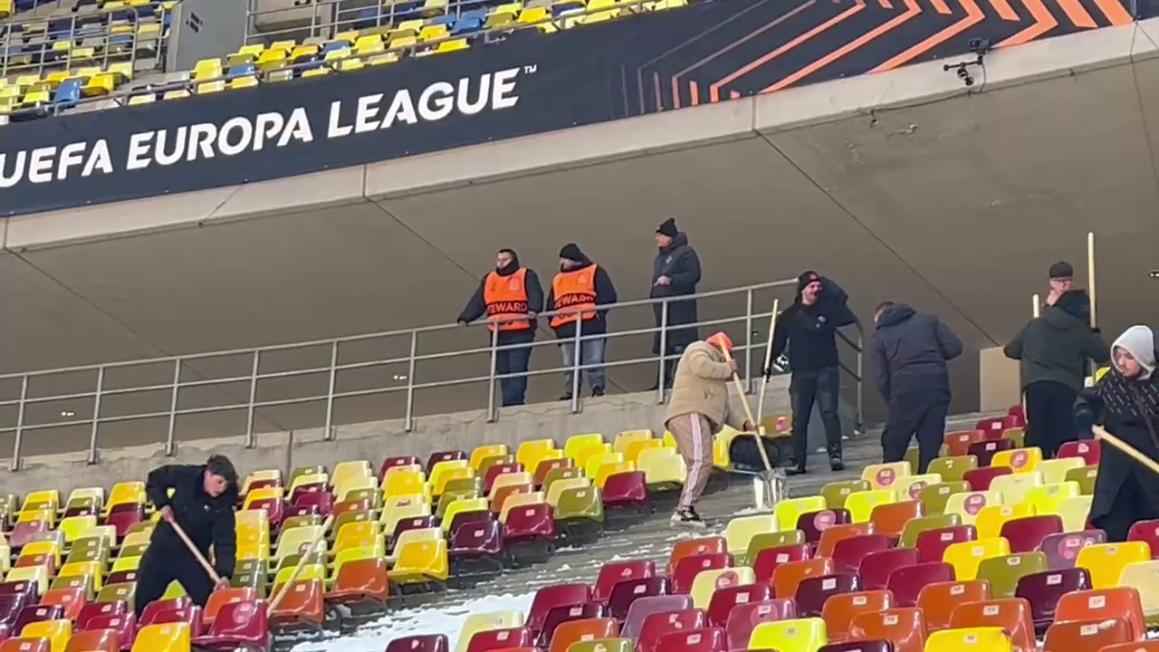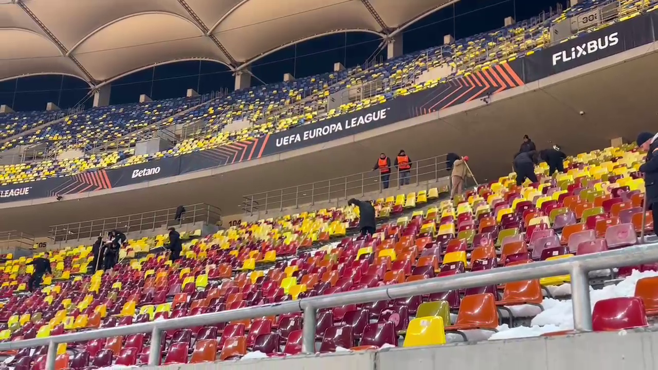 Aproximativ 200-300 de suporteri, echipați cu lopeți, s-au implicat prompt în deszăpezirea tribunelor Arenei Naționale, pentru a asigura desfășurarea partidei în condiții optime. Imaginile au fost transmise de corespondentul PRO TV, Paul Ciucă și pot fi văzute în galeria afișată mai jos.