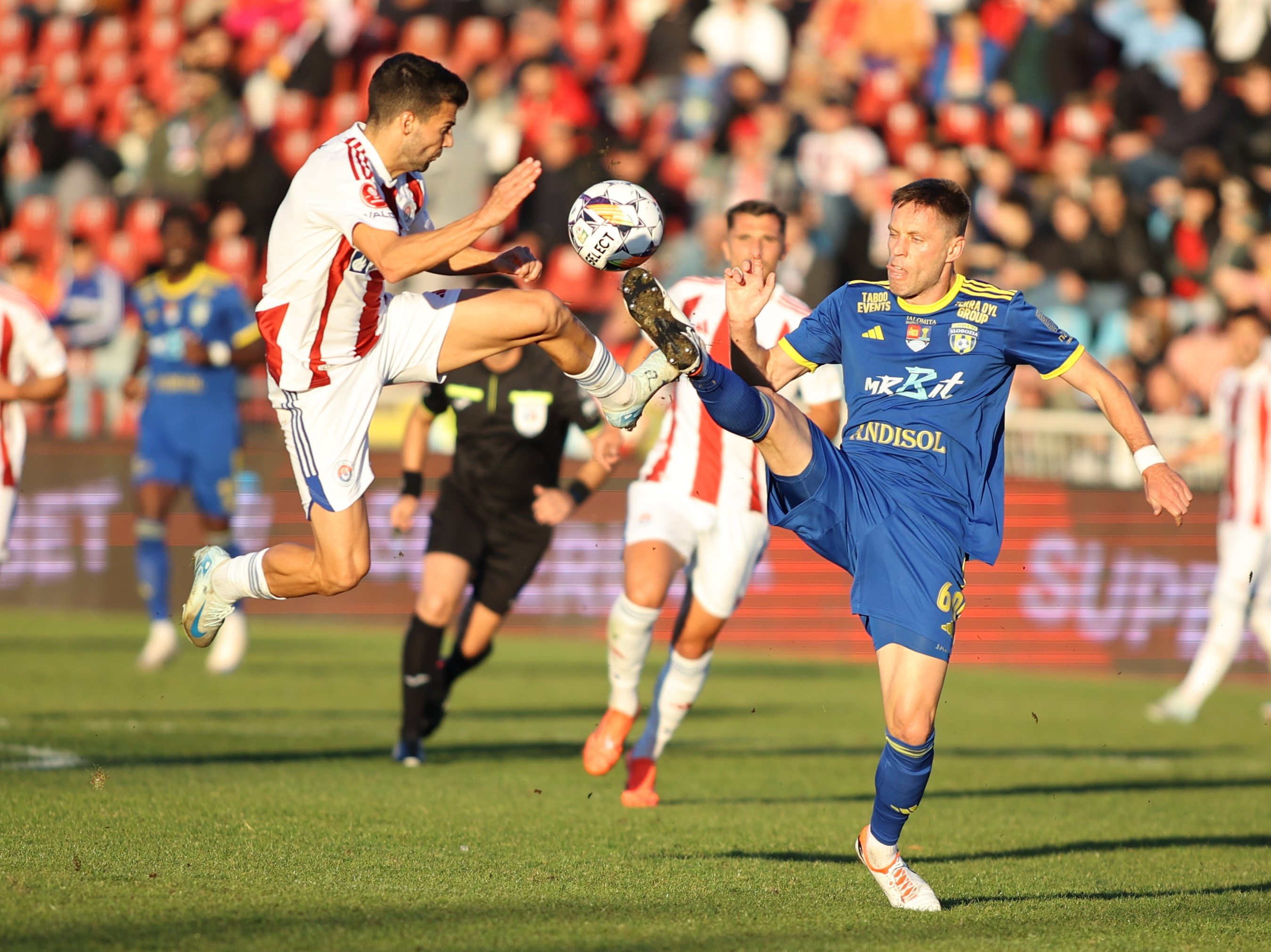 Min. 79: Ocazie Oțelul! Tănasă centrează de pe partea stângă, Adăscăliței încearcă să reia spre poartă, dar mingea îl lovește pe Juric și iese în afara terenului.