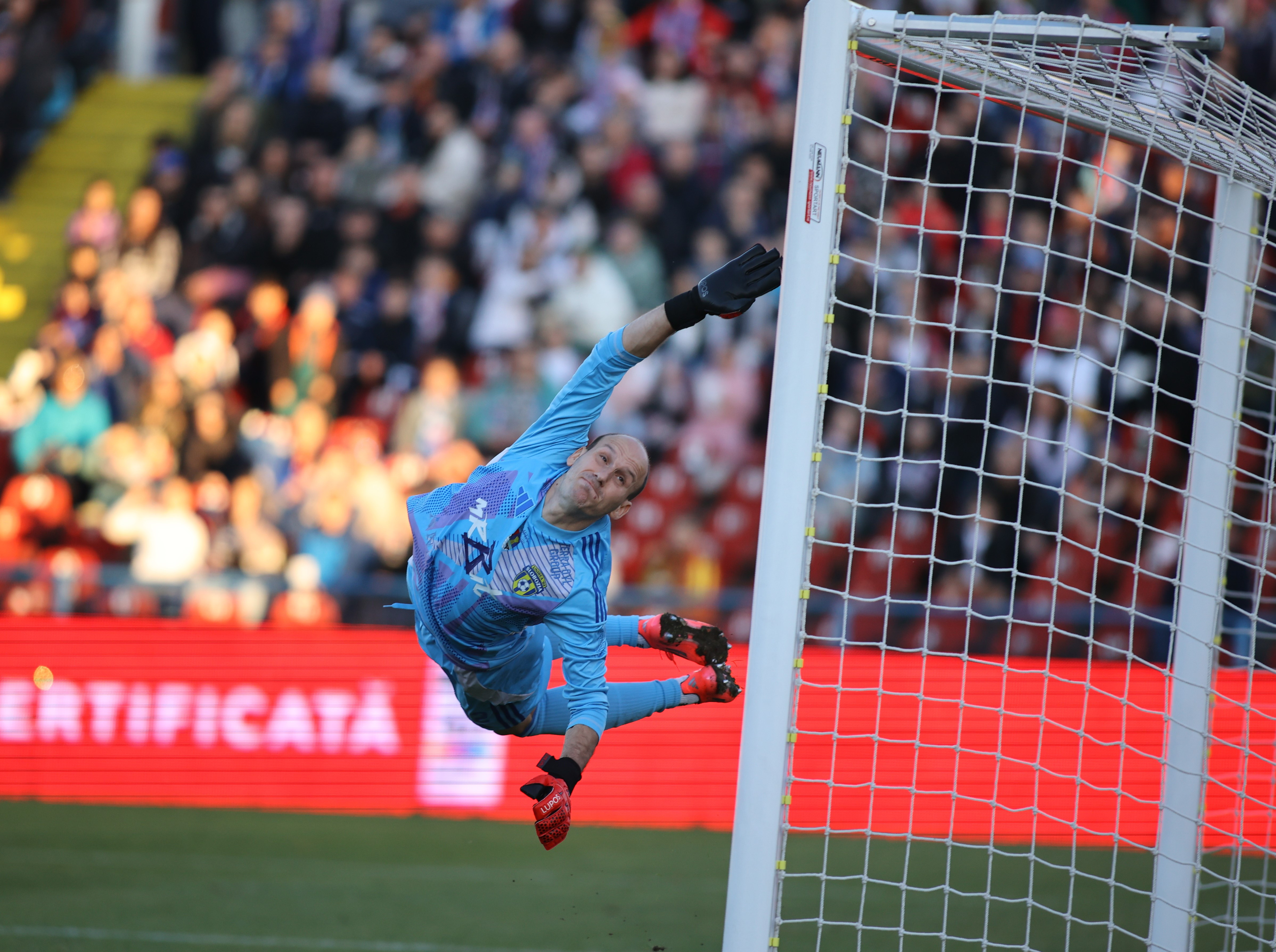 Min. 29: Ocazie Oțelul! Cisotti șutează în forță din afara careului cu piciorul stâng, dar balonul trece la o palmă peste transversală.