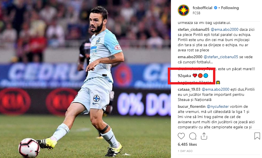 La despartirea de FCSB, clubul ros-albastru a postat pe pagina de Instagram o fotografie cu mijlocasul. El a replicat comentand cu o inimioara si doua buline in culorile rosu si albastru.