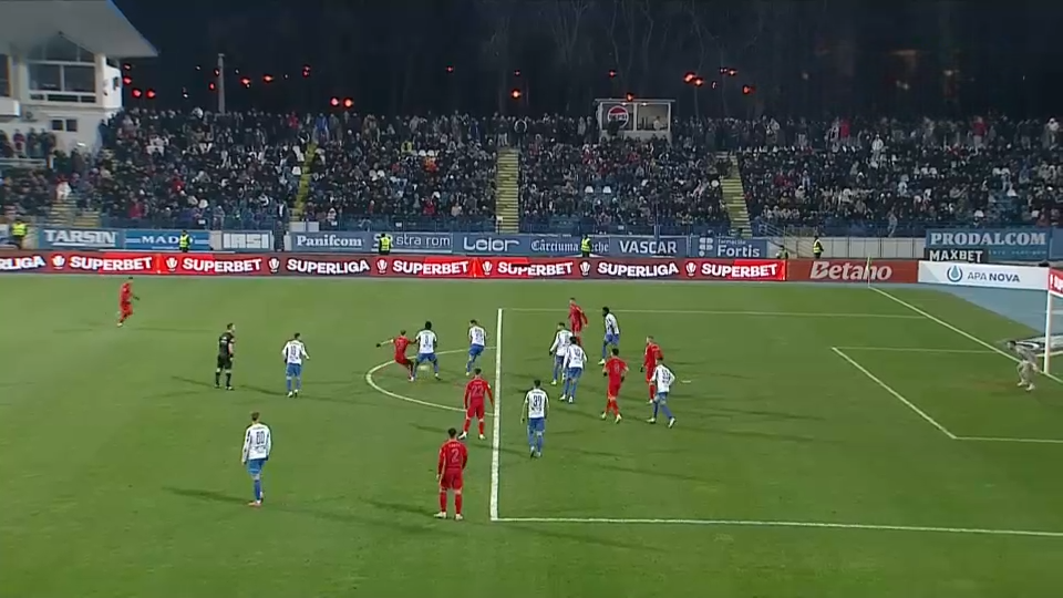 Minutul 17: Ocazie FCSB. La o lovitură liberă din marginea careului, poziție laterală, Olaru îi pasează lui Toma, care șutează din prima peste poartă. Mingea este deviată și se dictează corner.