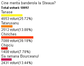 Chiriches a iesit de departe pe locul 1, urmat de doua optiuni surprinzatoare! Tanase, cel care a mai fost capitan la Steaua, si despre care suporterii spuneau ca nu merite sa poarte banderola dat fiind comportamentul sau din afara gazonului, a iesit pe locul 2, iar "groparul" Stelei in acest retur, Tatarusanu, a iesit pe locul 3!