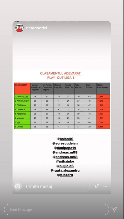 Si jucatorii lui Multescu s-au alaturat protestului. Toti fotbalistii cu prezenta in spatiul online au postat in aceasta seara o imagine cu clasamentul pe care il considera real, cel realizat in baza totalului de puncte castigate in sezonul regulat si playout.