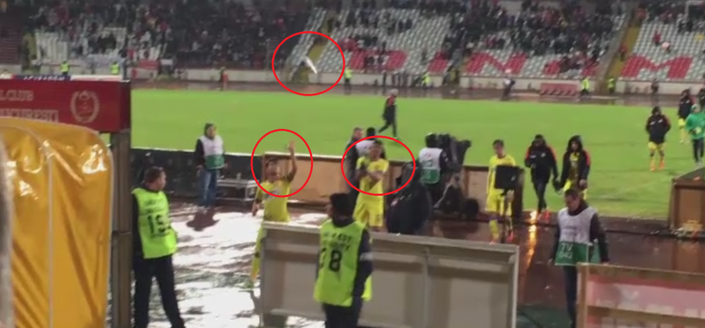 Nu doar antrenorul Stelei a fost tinta injuriilor. Stelistii au fost luati la rand in momentul in care se apropiau de tunel. Pustii Ontel si Mihalcea s-au ferit in timp ce un obiect zbura spre ei, in timp ce Nita, Adi Popa si Stanciu si-au primit de asemenea portia de ura din partea dinamovistilor.