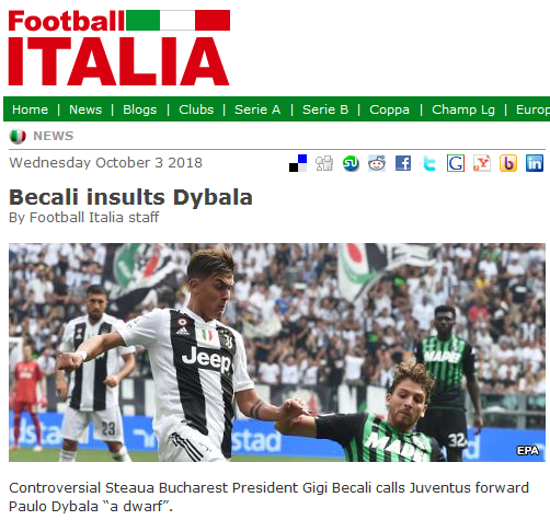Becali l-a numit "piticanie" pe Dybala, iar remarca lui a fost preluata de publicatia Football Italia.