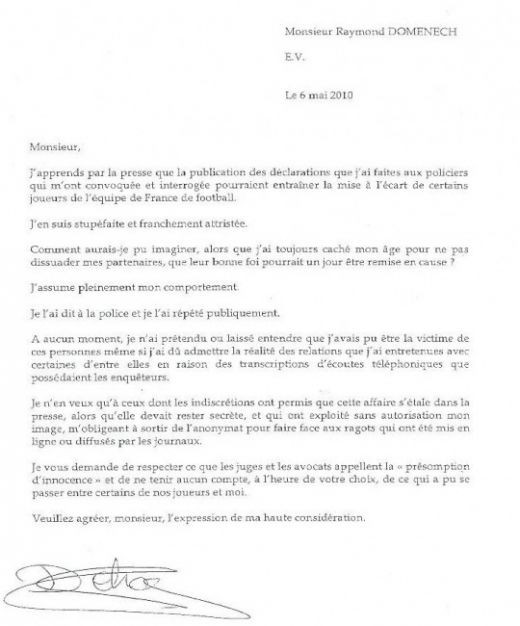 Prostituata cu care Ribery s-a culcat pe cand era minora i-a trimis lui Domenech cu cateva ore inainte sa faca publica lista pentru mondiale o scrisoare publicata integral de cei de L' Express.
