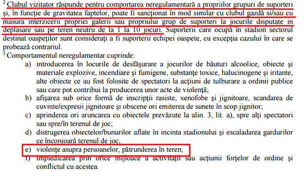 In Regulamentul Disciplinar se stipuleaza ca un club vizitator al carui fani se fac vinovati de tulburarea unui meci risca interzicerea propriei galerii la jocurile disputate in deplasare sau pe teren neutru de la 1 la 10 partide.