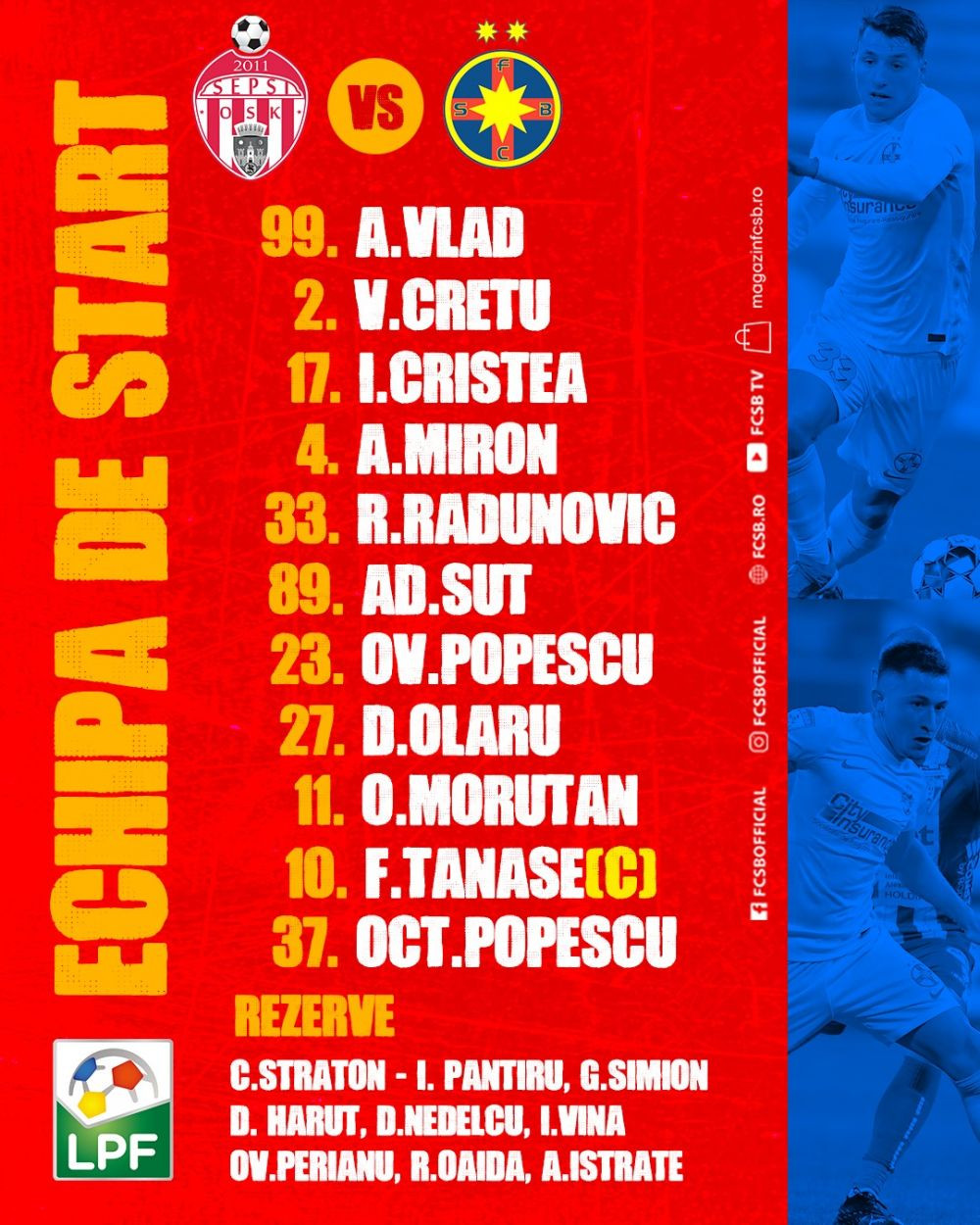 FCSB: Vlad - Cretu, Cristea, Miron, Radunovic - Ov. Popescu, Sut, Olaru - Morutan, Tanase, Oct. Popescu