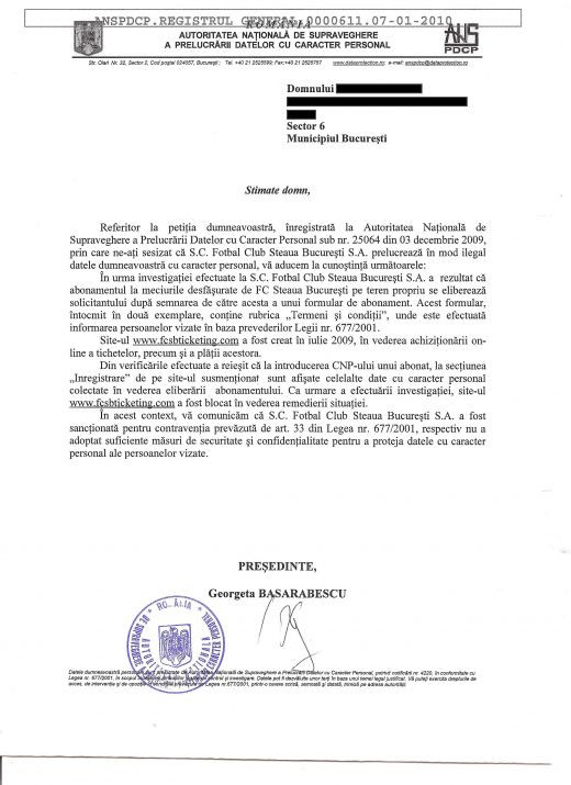 Site-ul suporterilor stelisti, fcsteaua.ro, a publicat raspunsul in scris primit de la Autoritatea Nationala.