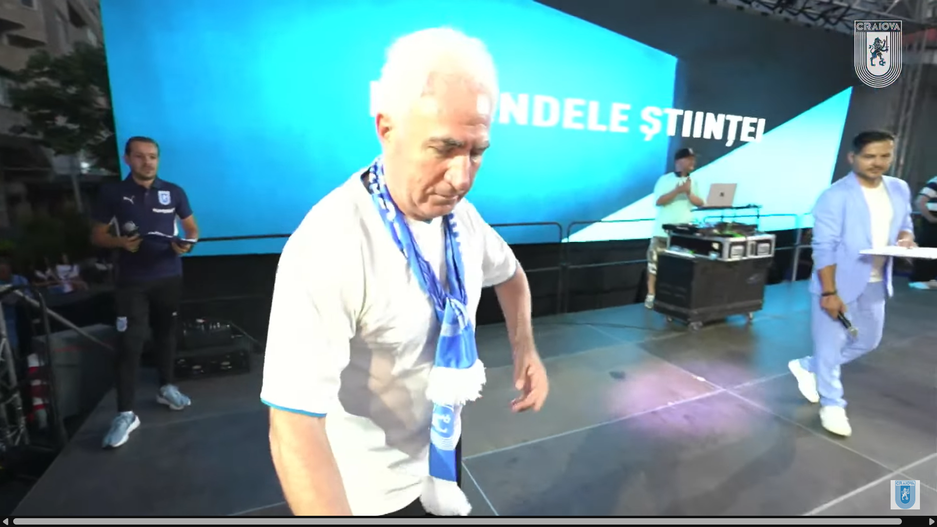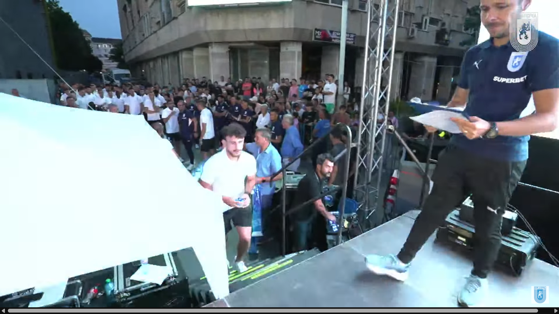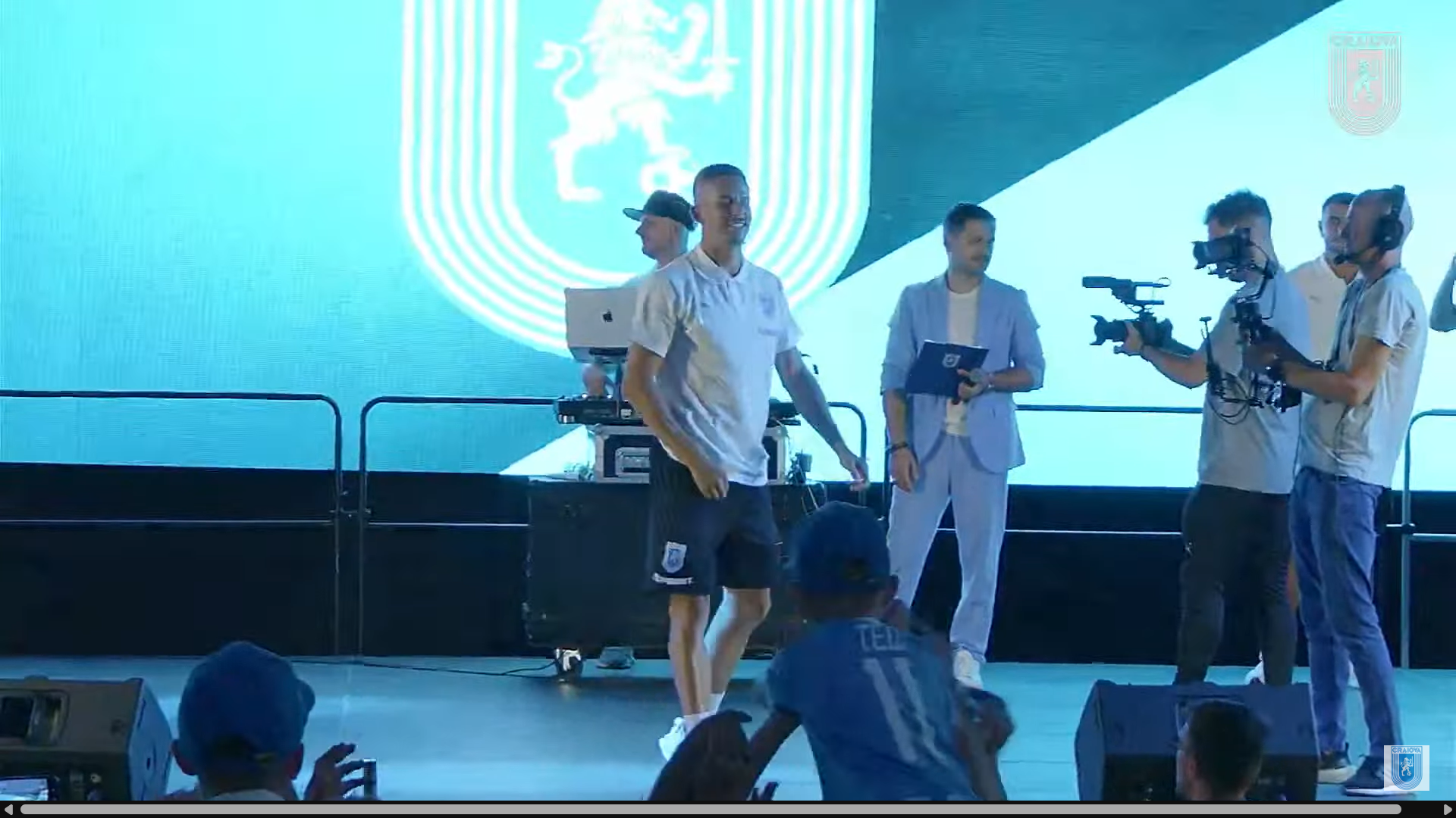 În cele din urmă, și-au făcut intrarea pe scenă și jucătorii Universității Craiova, însoțiți de staff-ul tehnic condus de Mirel Rădoi. A urmat apoi prezentarea echipamentului de deplasare, complet albastru, și cel special conceput pentru meciurile din Cupa României, în negru complet.