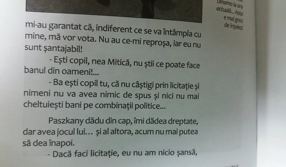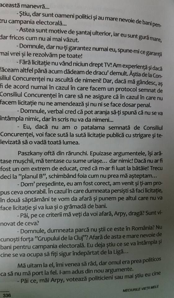 Fostul sef LPF a publicat in cartea sa dialogul care i-a decis soarta. Dragomir s-a opus vanzarii fara licitatie a drepturilor TV si n-a avut nicio sansa in fata unui mecanism despre care spune ca a fost pus la cale de forte politice. Dragomir sustine ca patronul CFR-ului, Arpad Paszkany, este cel care i-a propus sa vanda fara licitatie pachetele TV, in caz contrar amenintandu-l cu demiterea de la Liga. Paszkany se baza pe fostul premier, Victor Ponta, si pe Ioan Rus, si el ministru in acelasi cabinet.