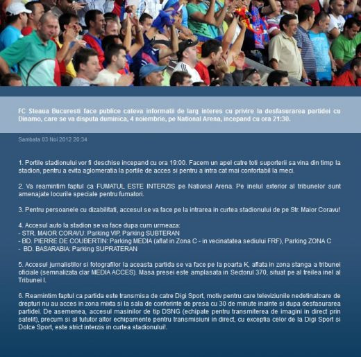16:33 Fanii obisnuiti sa nu gaseasca nimic interesant pe site-urile echipelor din Liga I ar trebui sa-si pastreze convingerile. Pe pagina online a Stelei gasiti un singur articol cu derby-ul la subiect. Aflati ca n-aveti voie sa fumati pe National Arena si ca trebuie sa veniti repede la stadion, ca sa nu asistati la razboiul de la cozi. Serios!?