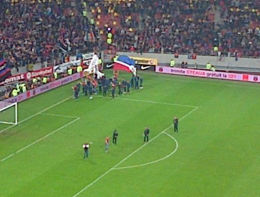 23:30 Jucatorii Stelei iau steagurile galeriei si se simt ultrasi. La fel si dinamovistii, carora le plac scandarile anti - Steaua. Sunt la cativa metri distanta, in fata peluzei unde au stat dinamovistii si stelistii de la Sud. Stari de spirit putin diferite. :)