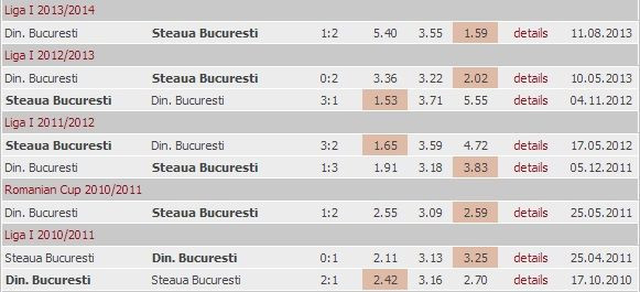 Ultima data cand s-au intalnit, in tur, Steaua a trecut de Dinamo cu scorul de 2-1, 'cainii' fiind echipa gazda. Cotele erau atunci de 5.40 pentru o victorie a lui Dinamo, Steaua era cotata cu 1,59, iar egalul valora 3,55.