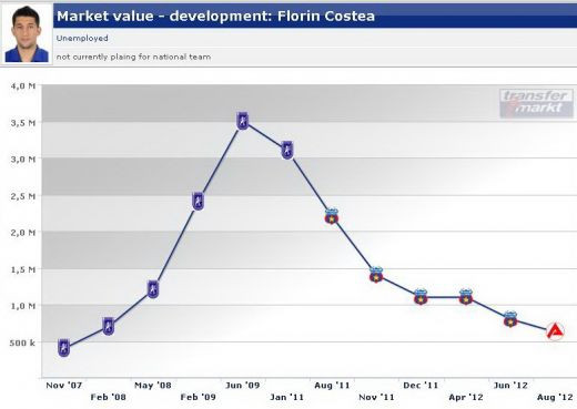 Cota lui Florin Costea a scazut dramatic in ultimii trei ani, cand era evaluat de transfermarkt.de la 3,5 milioane de euro.