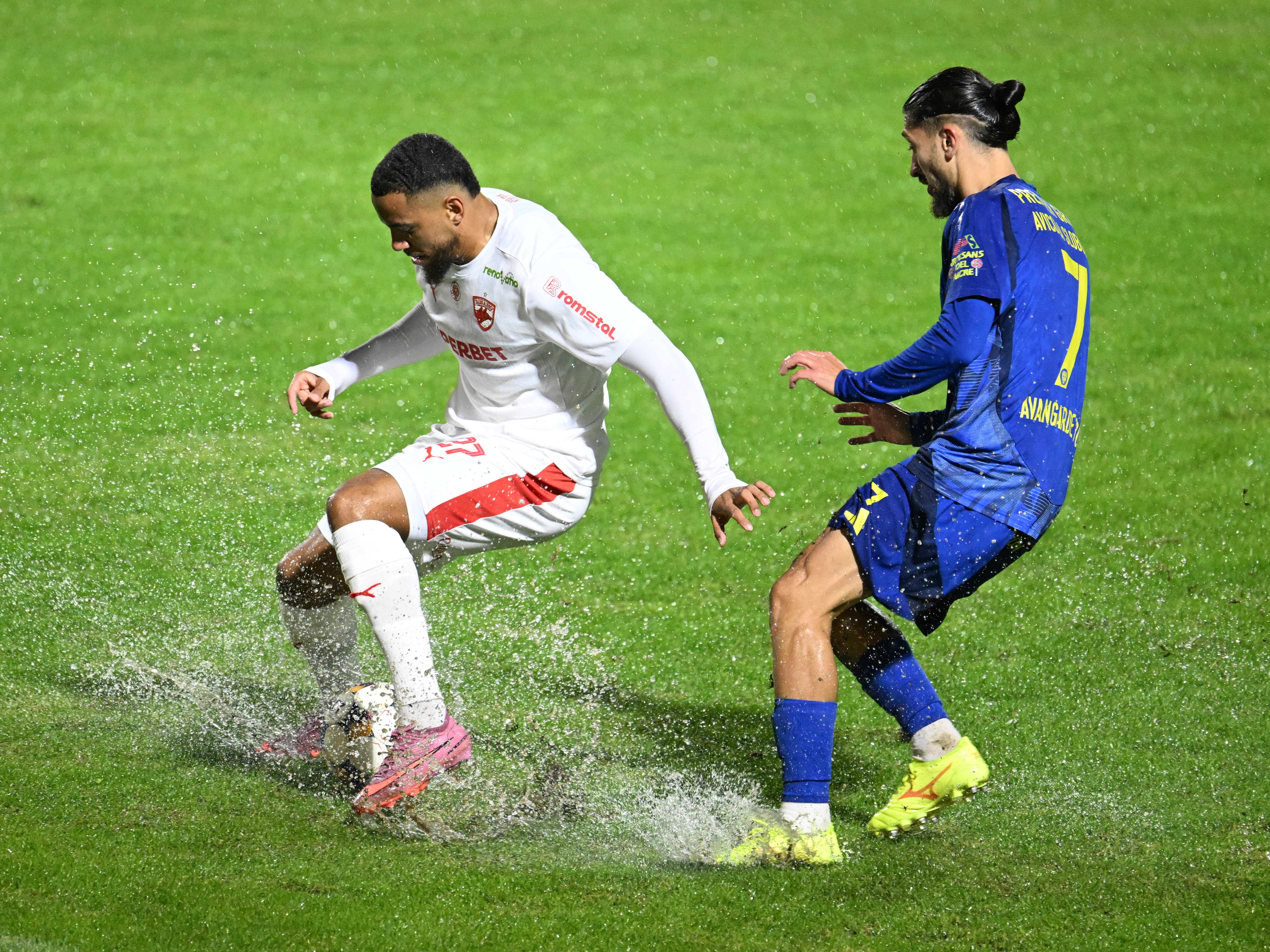 Încă din primele minute, mingea s-a oprit în bălți, iar fazele de joc au fost fragmentate. Nicio echipă nu a reușit să lege pase, iar spectacolul a fost înlocuit de dueluri haotice și mingi care nu treceau mai departe de câțiva metri.