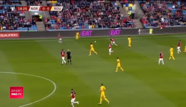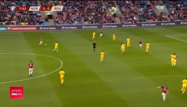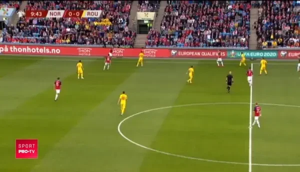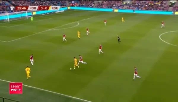 Min. 26: Marius Constantin vede cartonasul galben dupa ce l-a lovit pe Dennis Man cu cotul in timpul unui duel aerian!