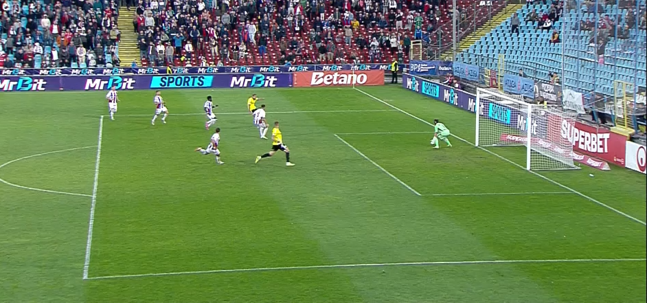 Un episod similar s-a produs și în prima repriză. Patrick a înscris pentru 1-0 în minutul 30, însă VAR-ul a intervenit și aici, iar după 6 minute a stabilit că jucătorul Oțelului se afla în poziție de ofsaid, astfel că golul a fost anulat.